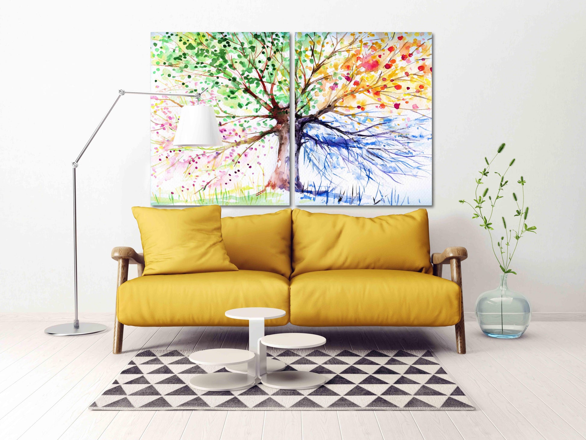 Wandbild mit Baummotiven für die vier Jahreszeiten. Wandbilder auf Leinwand mit Bäumen für die vier Jahreszeiten, Wanddekoration für Ihr Zuhause. Mehrteilige Wandbilder in verschiedenen Größen, von übergroß bis extragroß. Das Wandbild wird waagefertig geliefert und erfordert keine zusätzliche Anmeldung.