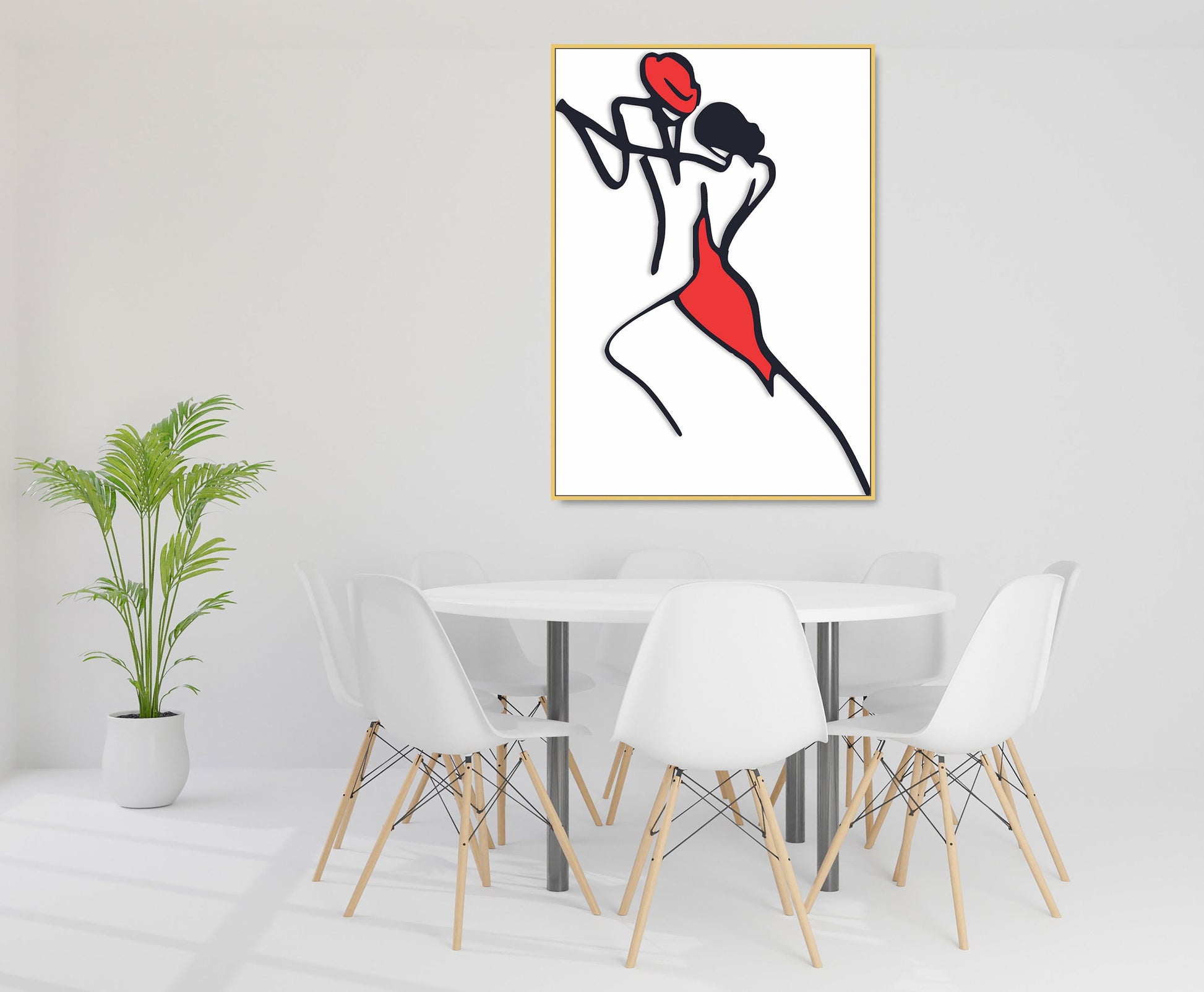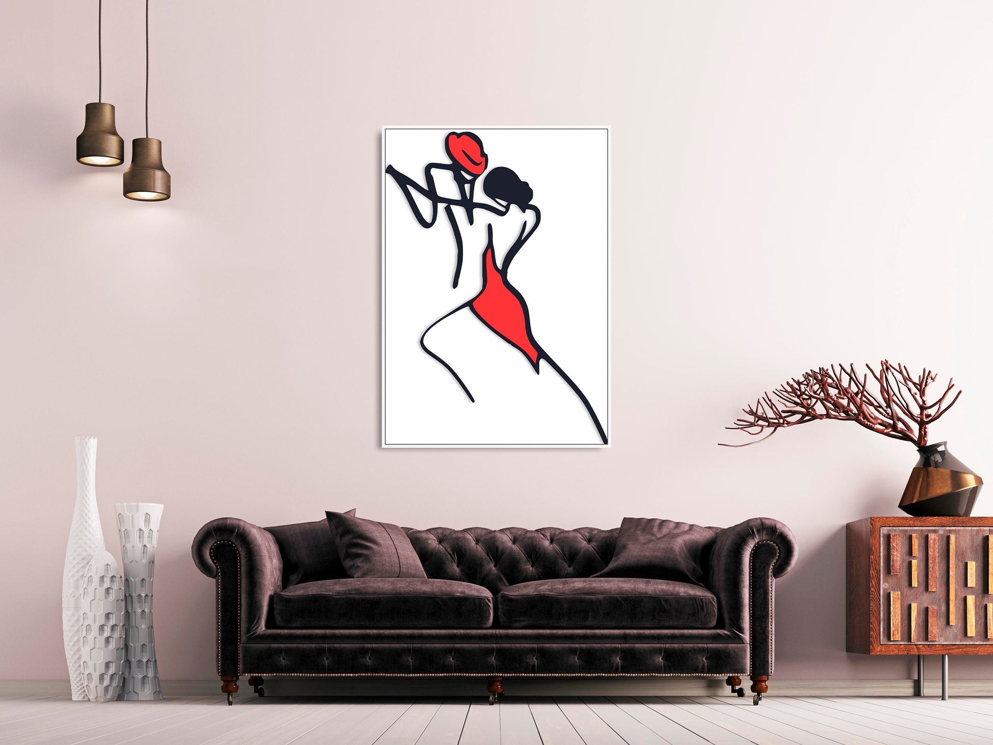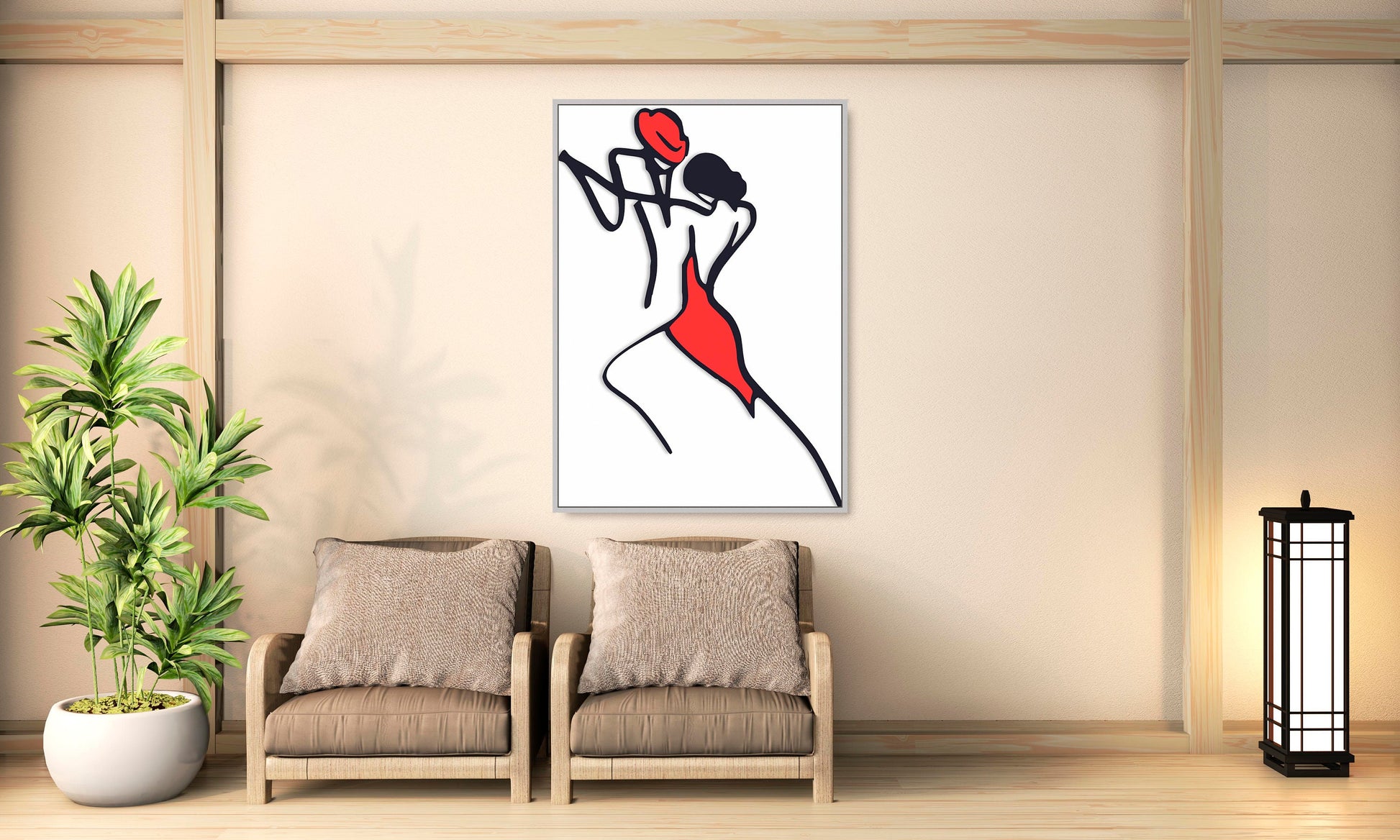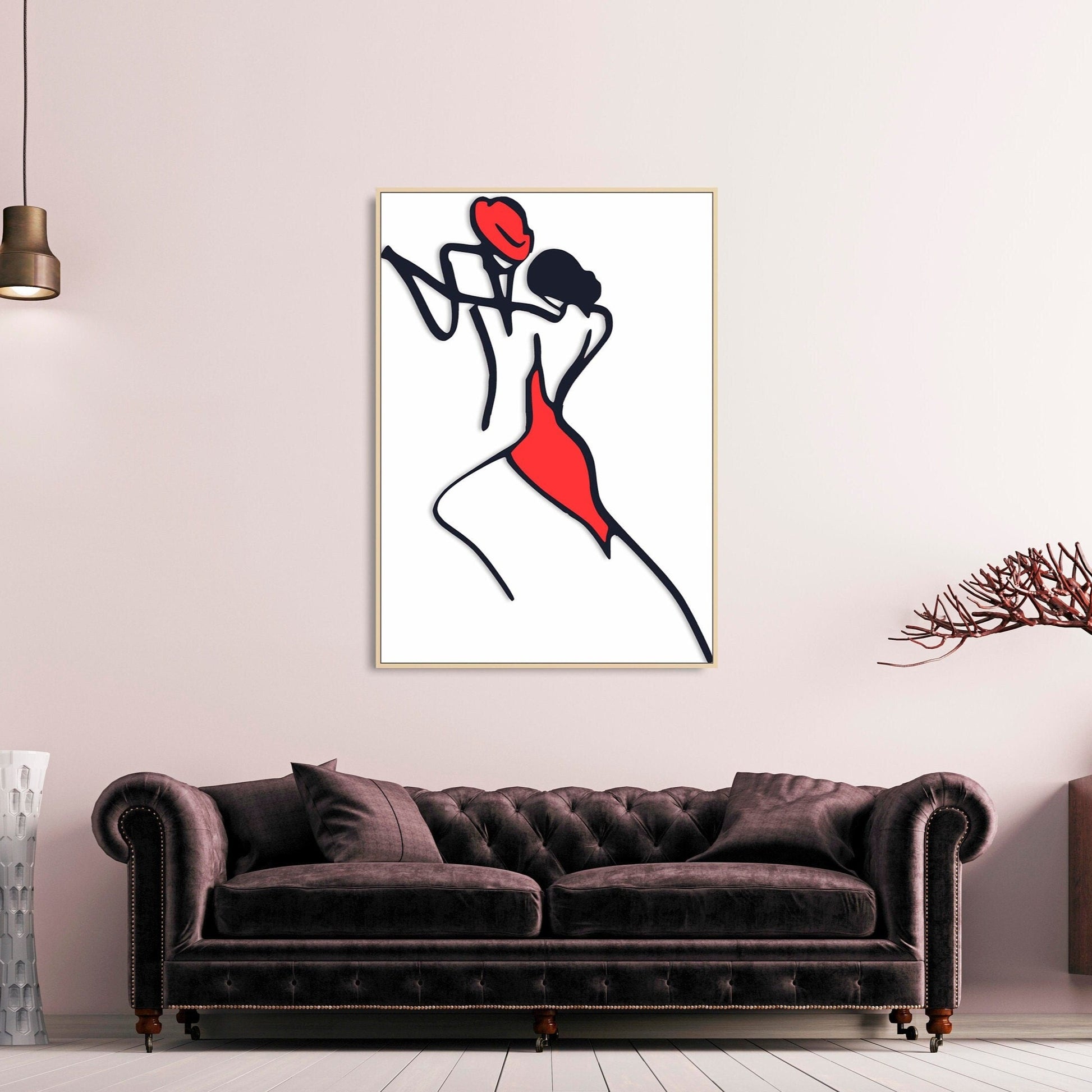 Abstraktes Paar-Wandbild, modernes gerahmtes Leinwandbild mit einer Linie, schwarz-rotes druckbares Wanddekor im schwebenden Rahmen, Liebeswandbild