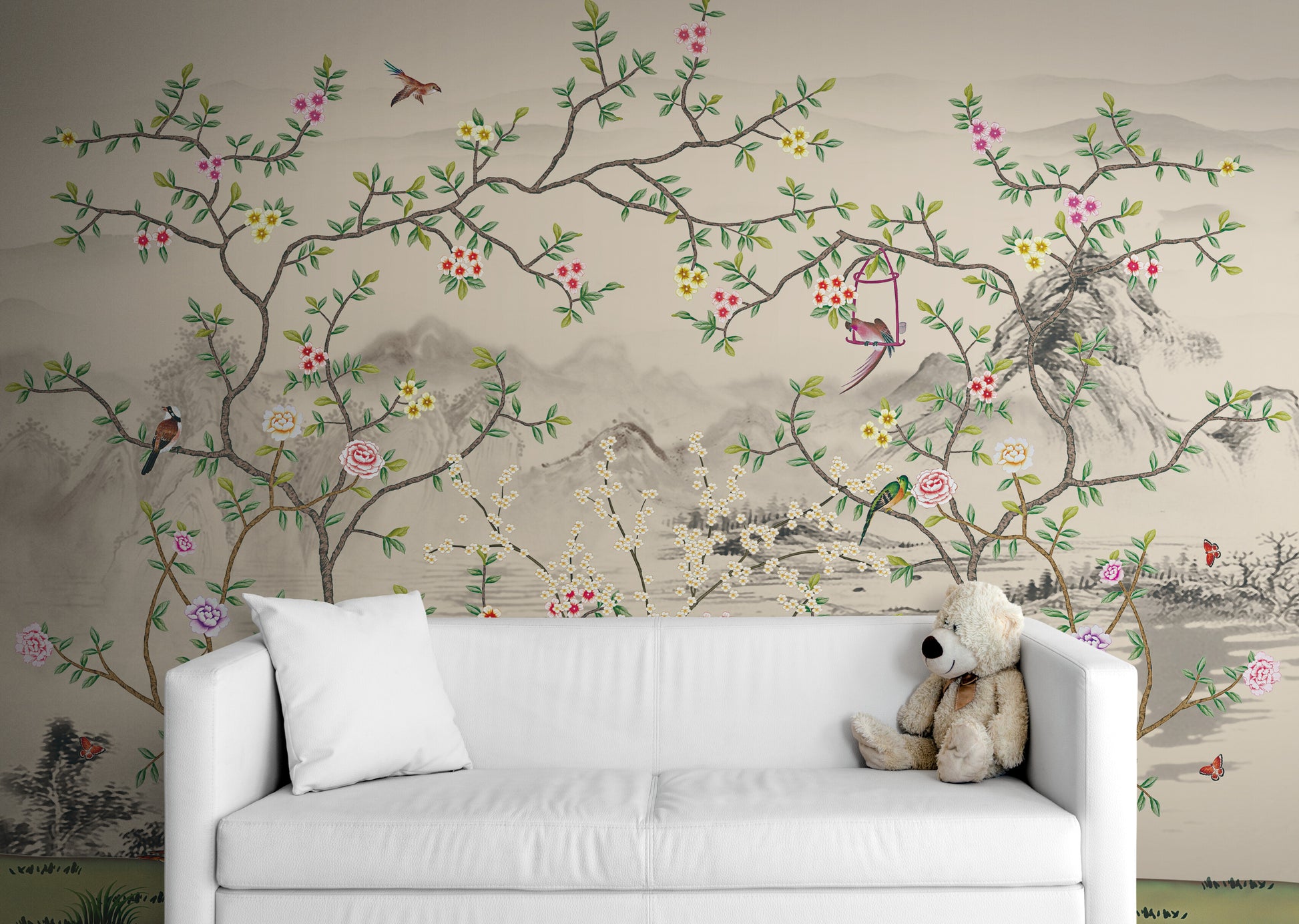 Chinoiserie Tapeten Wandbild, Botanische Tapete zum Abziehen und Aufkleben, Selbstklebende Vogeltapete, Extra großes Natur Wandbild