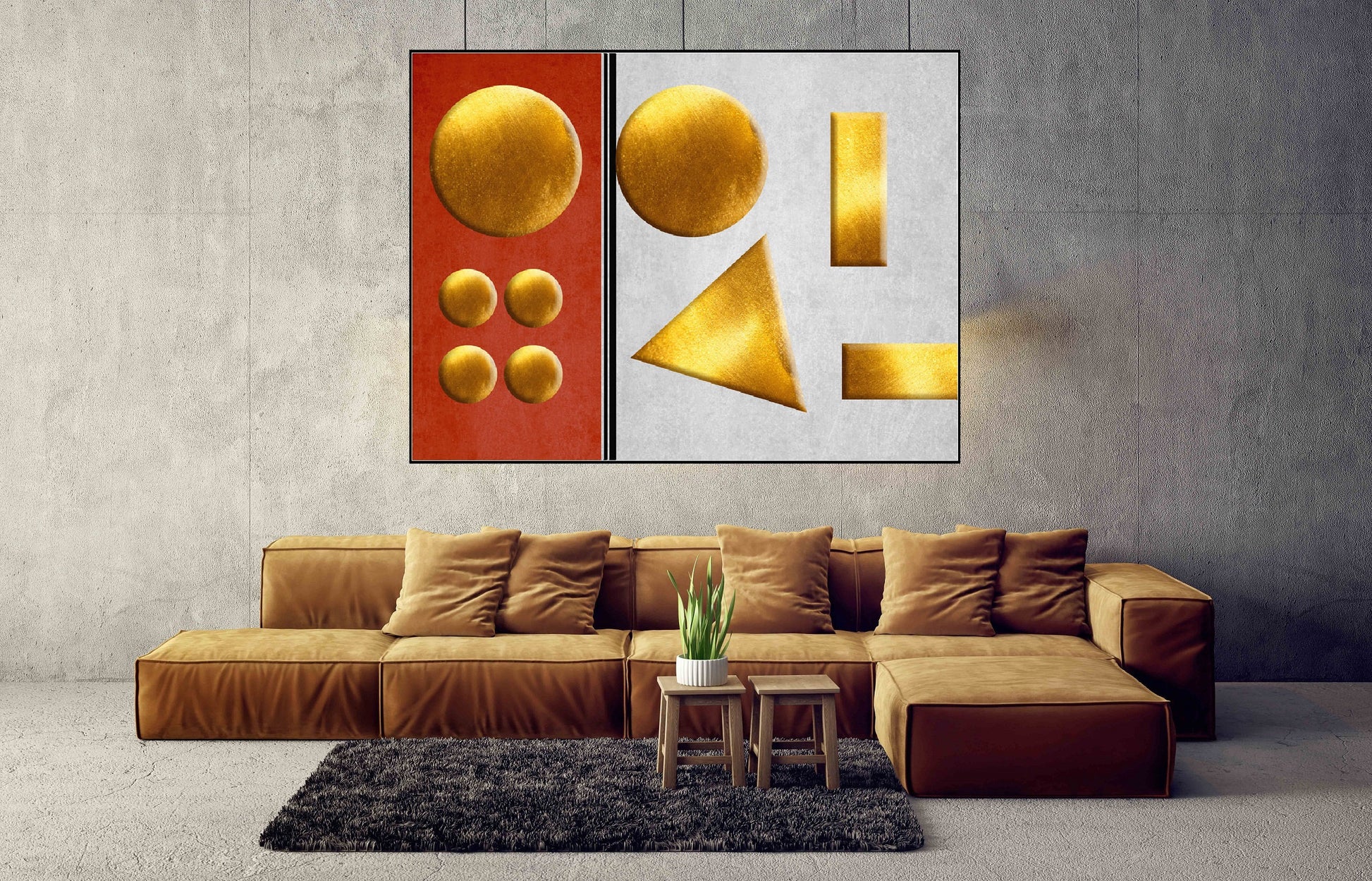 • Die Größe eines Gemäldesets, das aus mehreren Tafeln besteht, ergibt sich aus der Addition der Tafeln. Es wird empfohlen, solche Sets mit einem Abstand von 2,5–5 cm zwischen den Tafeln an der Wand zu platzieren. Je größer die Bildelemente sind, desto größer ist der zulässige Abstand zwischen ihnen.