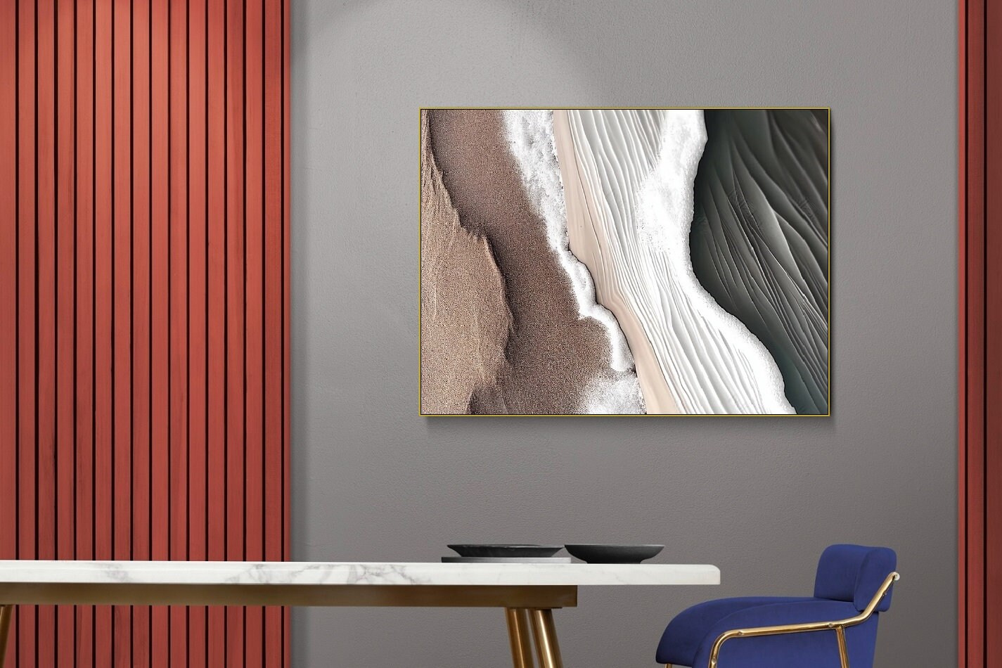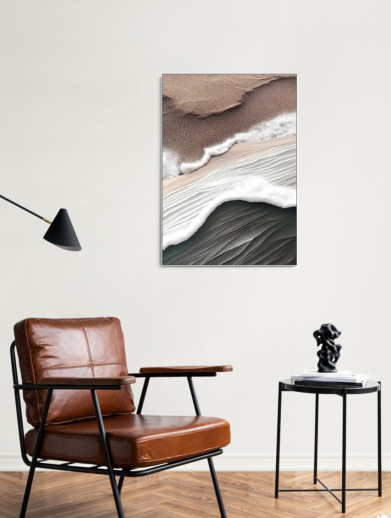 Abstrakte gerahmte Wandkunst, Wellen-Wanddekoration, brauner Leinwanddruck mit schwebendem Rahmen, großes druckbares Wohnzimmer-Kunstwerk, Impression-Kunstwerk