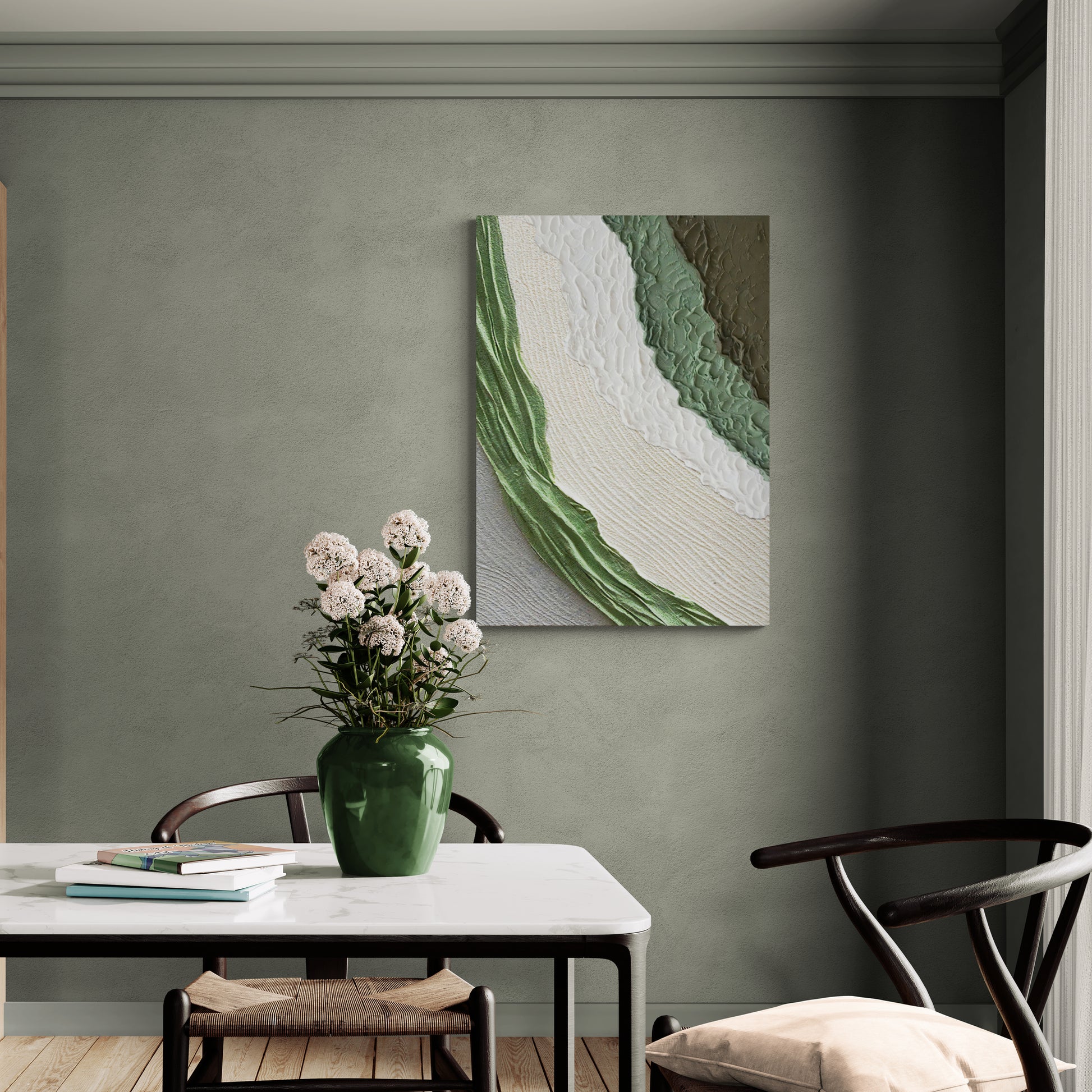 Abstrakte Wandkunst, grün-weißer Kunstdruck, moderner gerahmter Leinwanddruck, Wandkunst mit Ölgemälde-Effekt, Geschenk zur Wohnungserwärmung, Wandkunst fürs Wohnheim