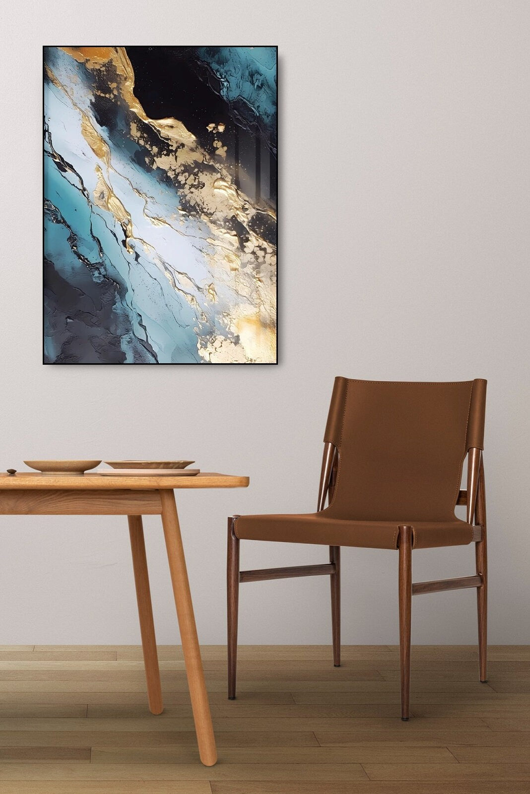 Abstraktes druckbares Kunstwerk, schwebender Rahmen, Marmor-Wandkunst, moderner gerahmter Leinwanddruck, blau-goldene Wohnzimmer-Wandkunst, Kunstwerk zum Verschenken