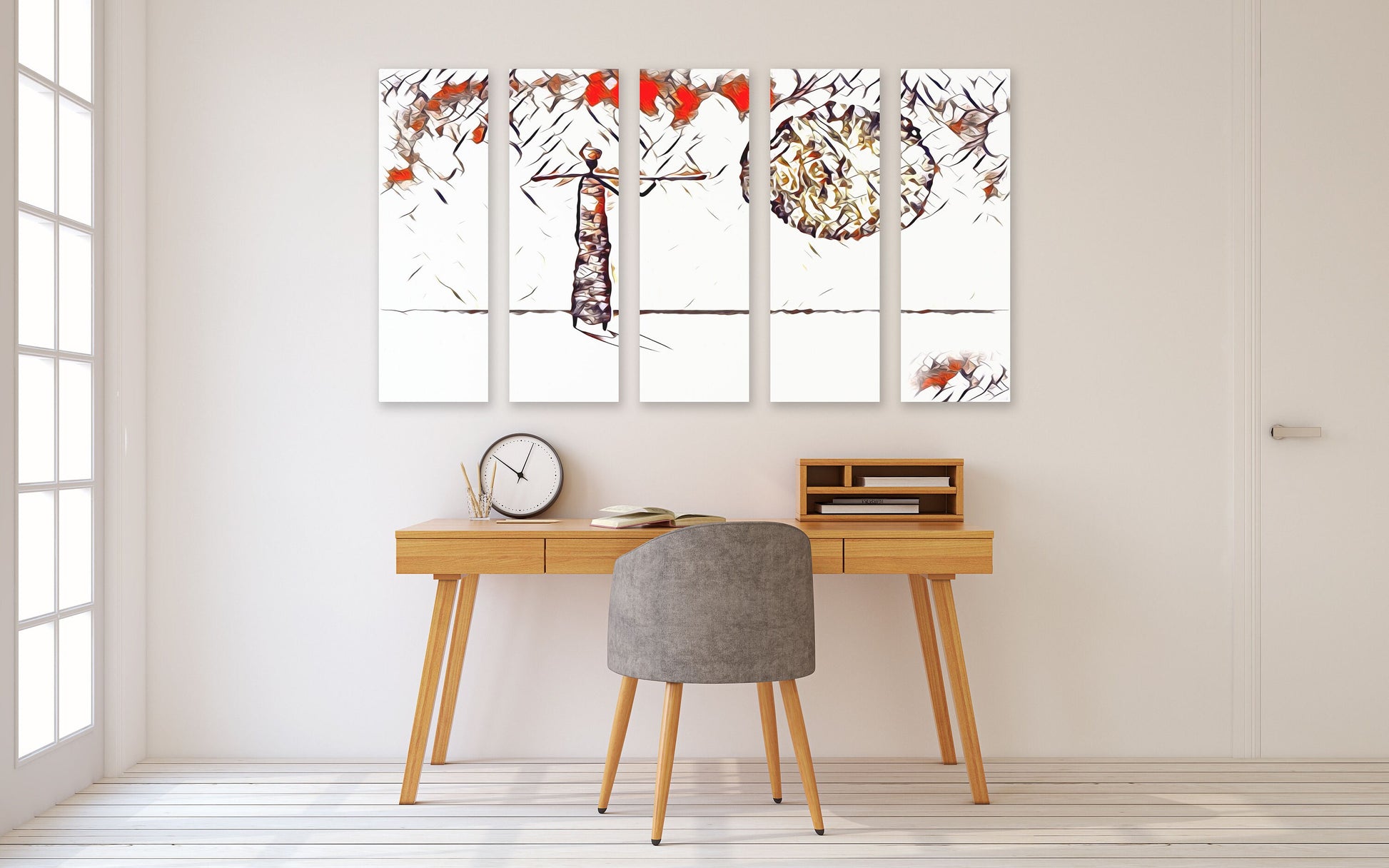 •Die Größe eines Gemäldesets, das aus mehreren Tafeln besteht, wird berechnet, indem die Tafeln addiert werden. Es wird empfohlen, solche Sets mit einem Abstand von 2,5–5 cm zwischen den Paneelen an der Wand zu platzieren. Je größer die Bildelemente, desto größer ist der zulässige Abstand zwischen ihnen.
