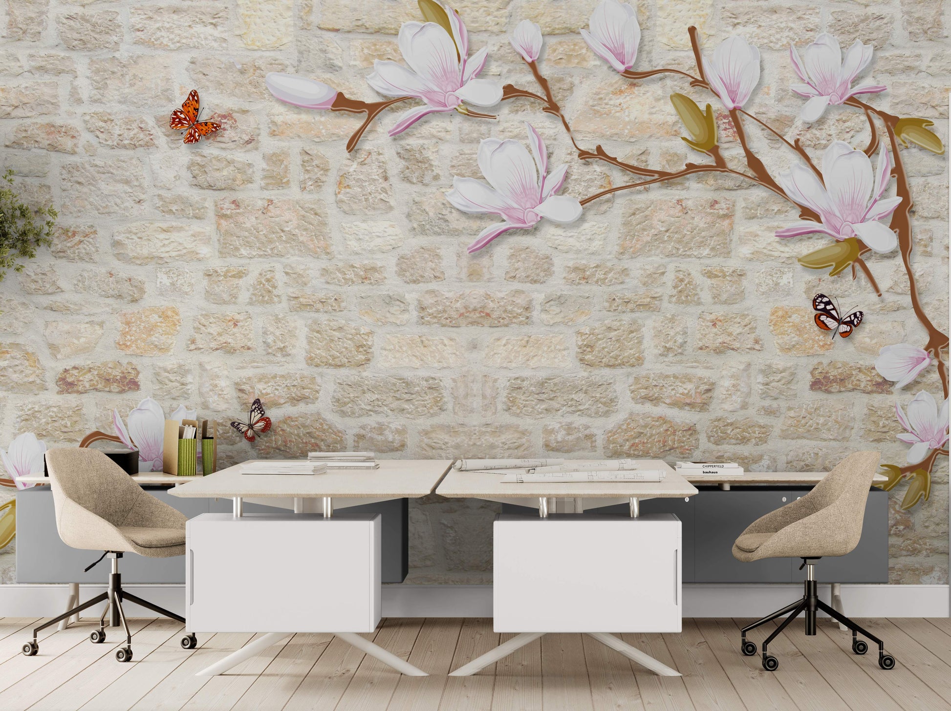 Tapete mit Magnolienblüten, abziehbares Wandbild mit Schmetterlingen und Bäumen, selbstklebende Tapete mit Ziegeln, abnehmbares Wandbild im Loft-Stil, florale Akzenttapete, Wandbild im Chinoiserie-Stil