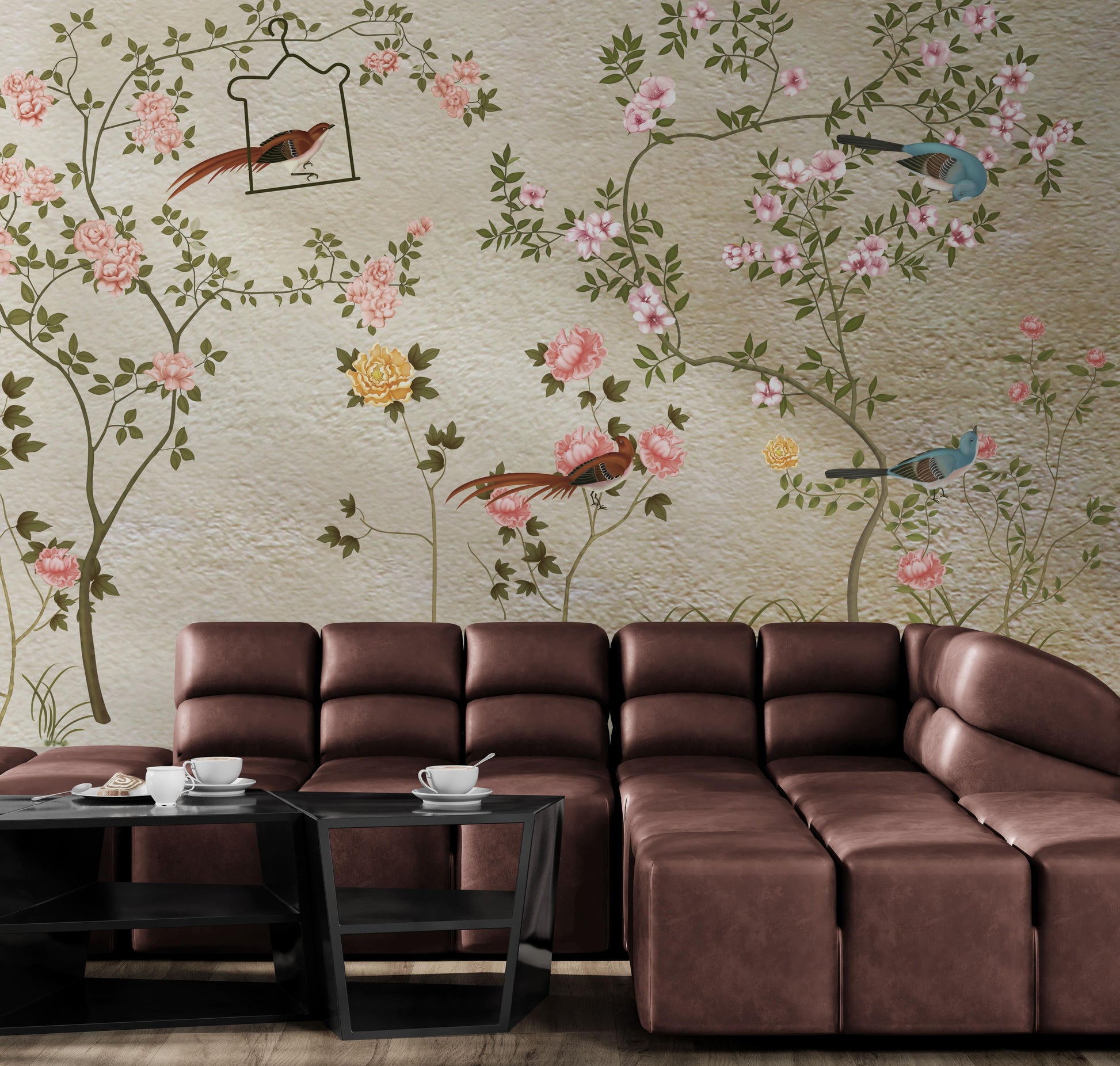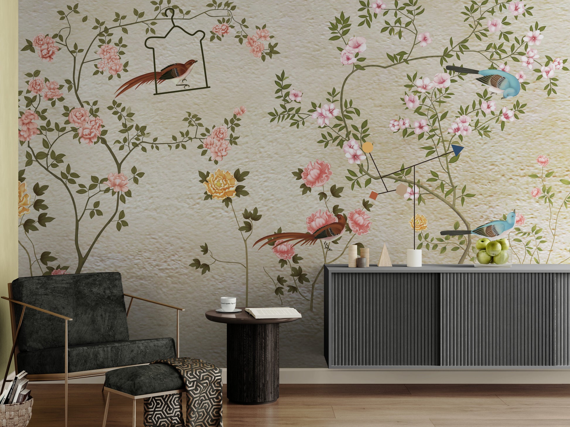 Wandbild mit Vögeln und Bäumen, botanische Japandi-Tapete, selbstklebendes Wandbild mit Sakura-Blüten, florales orientalisches Wandbild, Chinoiserie-Tapete, abziehbare und aufklebbare Tapetenwand fürs Schlafzimmer