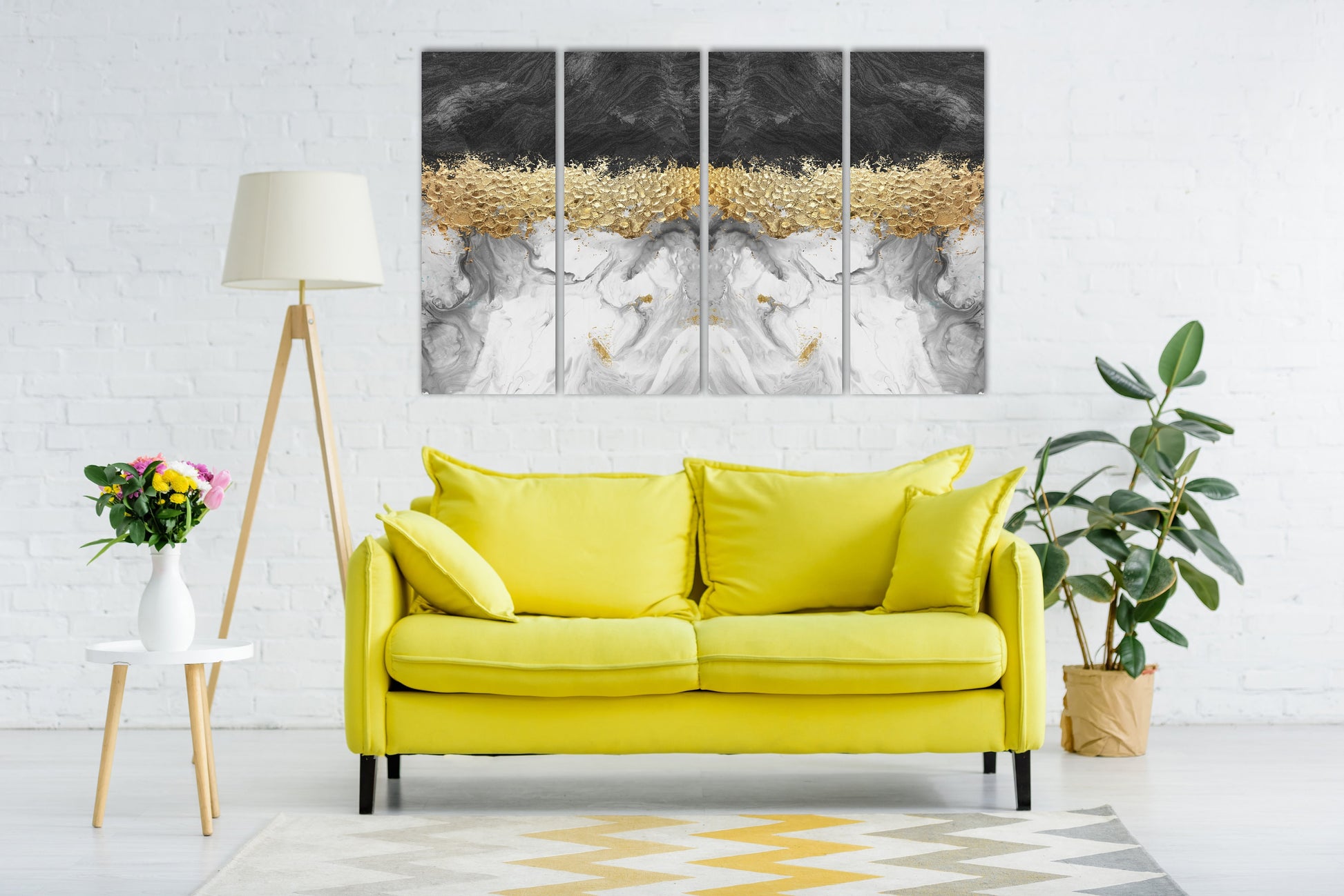 •Die Größe eines Gemäldesets, das aus mehreren Tafeln besteht, wird berechnet, indem die Tafeln addiert werden. Es wird empfohlen, solche Sets mit einem Abstand von 2,5–5 cm zwischen den Paneelen an der Wand anzubringen. Je größer die Bildelemente sind, desto größer ist der zulässige Abstand zwischen ihnen.