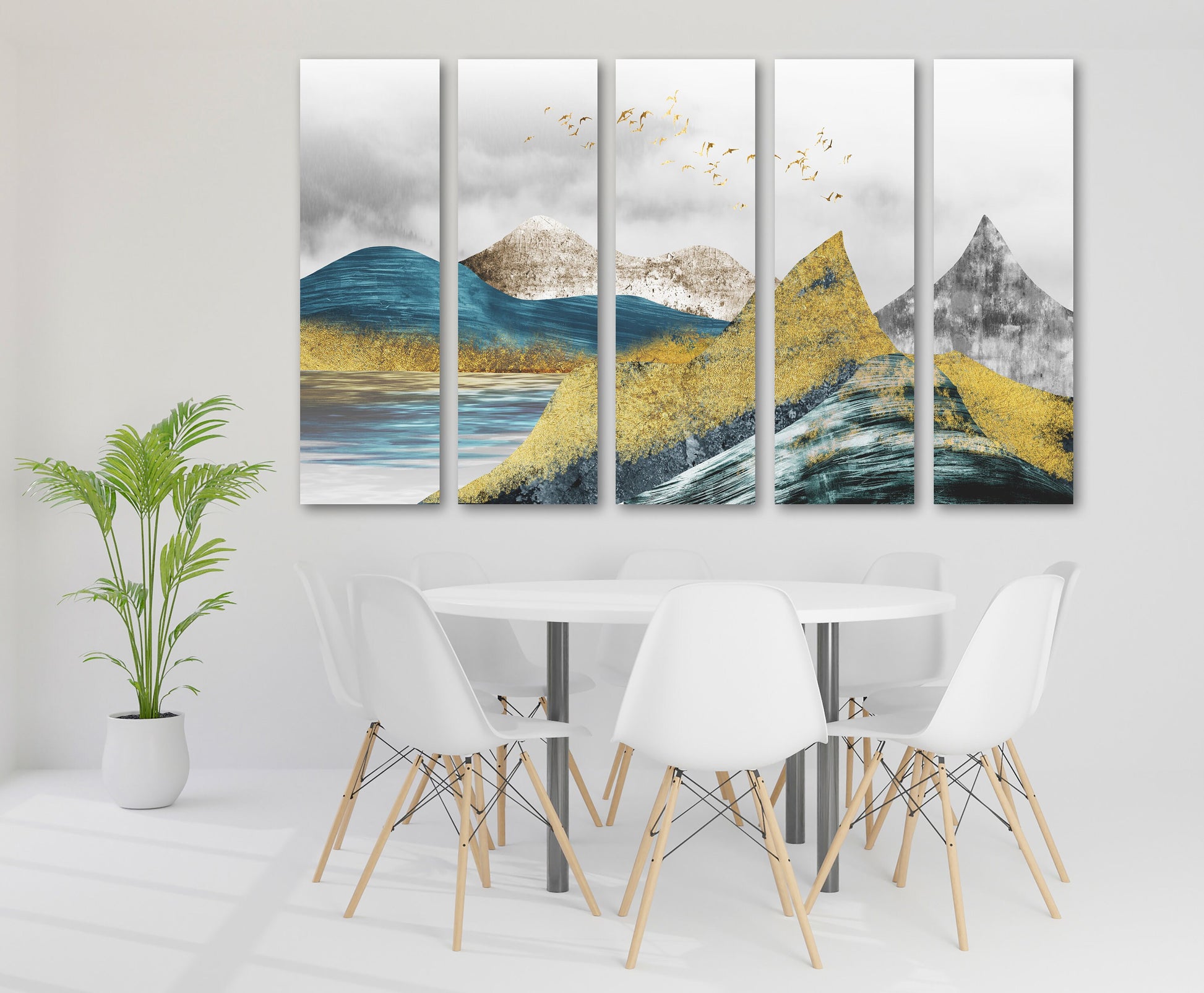 •Die Größe eines Gemäldesets, das aus mehreren Tafeln besteht, wird berechnet, indem die Tafeln zusammengezählt werden. Es wird empfohlen, solche Sets mit einem Abstand von 1–2 Zoll zwischen den Tafeln an der Wand anzubringen. Je größer die Bildelemente, desto größer ist der zulässige Abstand zwischen ihnen.