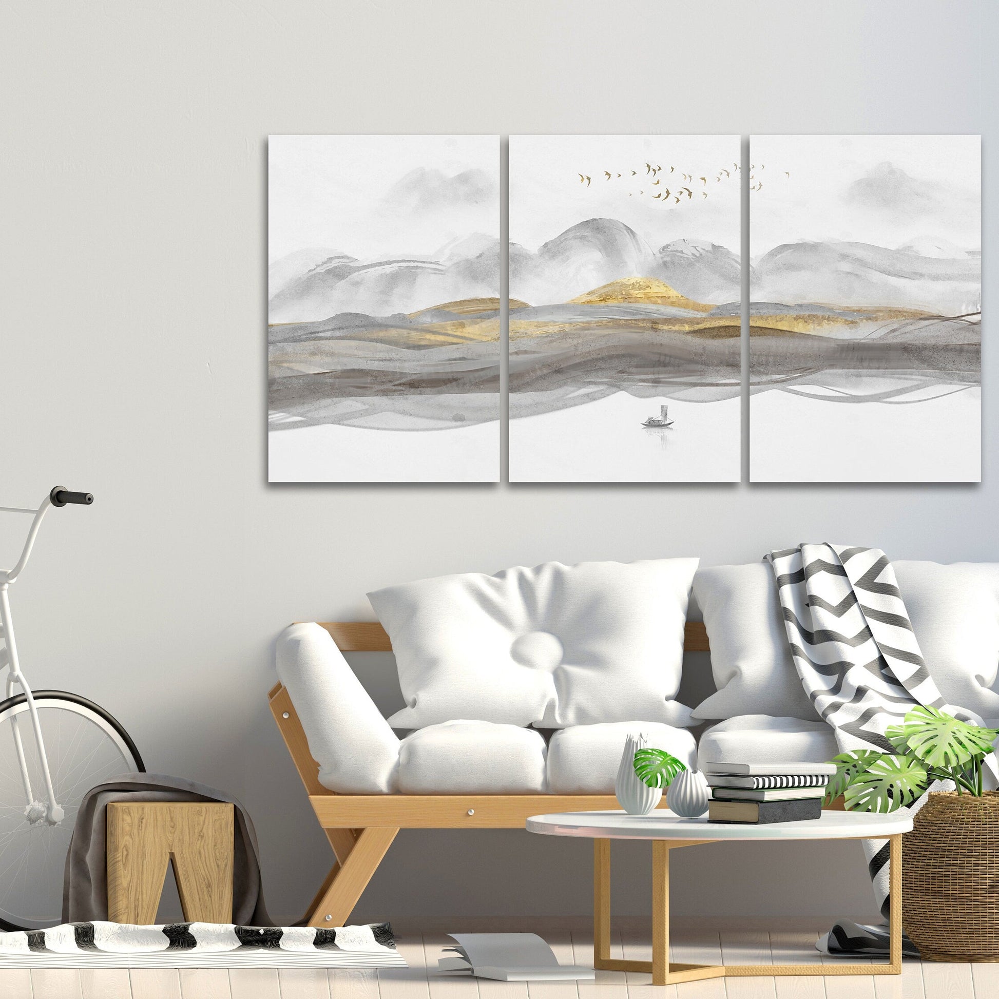 •Die Größe eines Gemäldesets, das aus mehreren Tafeln besteht, wird berechnet, indem die Tafeln zusammengezählt werden. Es wird empfohlen, solche Sets mit einem Abstand von 1–2 Zoll zwischen den Tafeln an der Wand anzubringen. Je größer die Bildelemente, desto größer ist der zulässige Abstand zwischen ihnen.