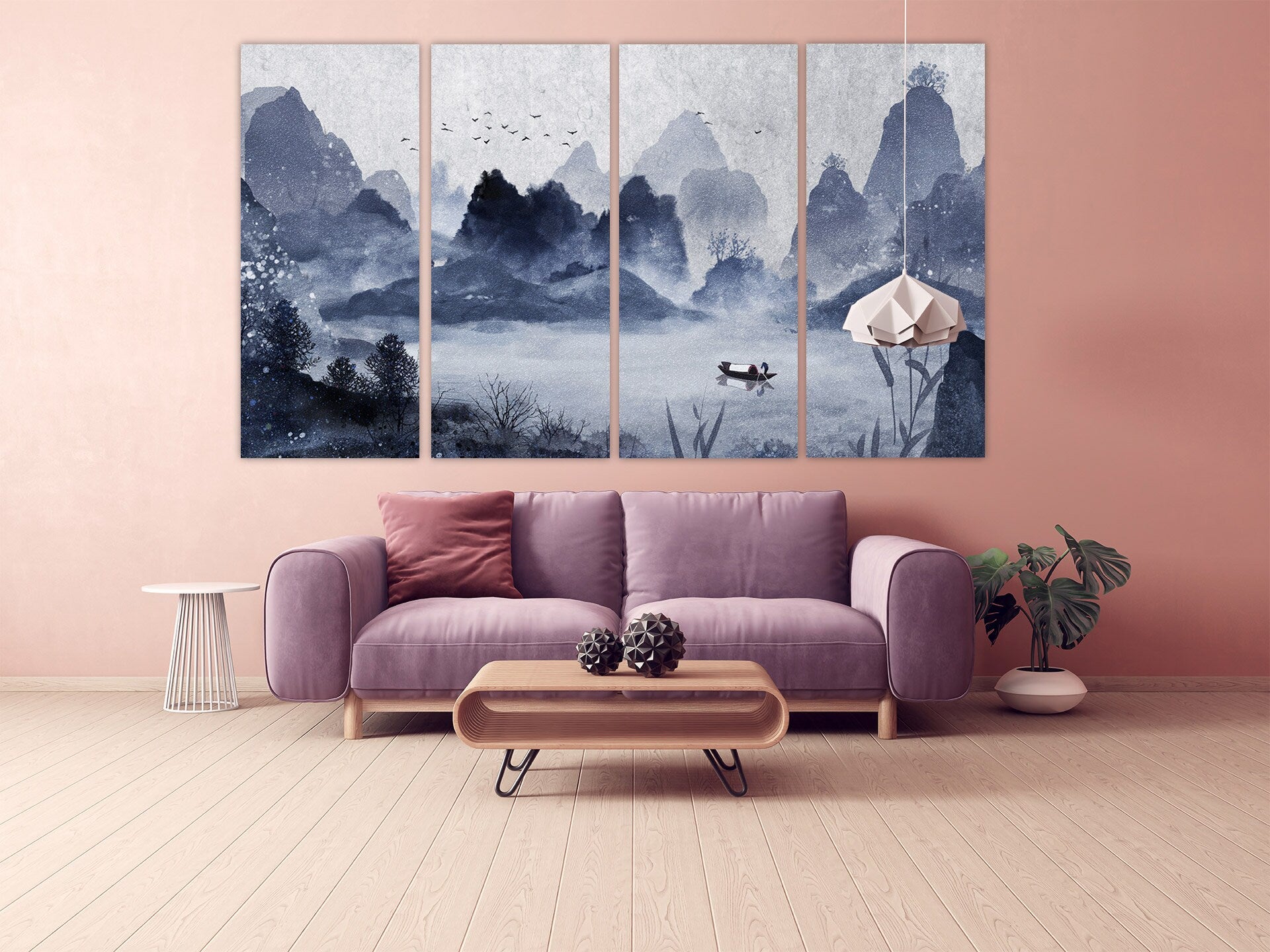 • Die Größe eines Gemäldesets, das aus mehreren Tafeln besteht, wird berechnet, indem die Tafeln zusammengezählt werden. Es wird empfohlen, solche Sets mit einem Abstand von 1–2 Zoll zwischen den Tafeln an die Wand zu hängen. Je größer die Bildelemente sind, desto größer ist der zulässige Abstand zwischen ihnen.