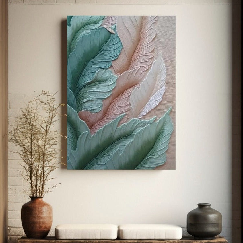 Botanische 3D-Wandkunst, großer Blätter-Leinwanddruck, grün-rosa Floater-Rahmen-Kunstwerk, abstrakte Wohnzimmer-Wandkunst, volumetrisches Geschenk-Kunstwerk
