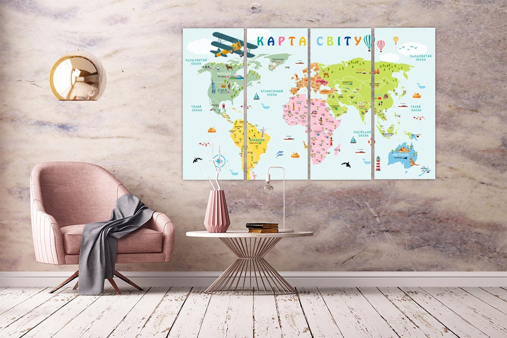 Wandkunst für Jungenzimmer, Weltkarte für Kinder, Wandkunstgemälde auf Leinwand, Wanddekoration für Zuhause, Leinwandgemälde, Weltkarte auf Leinwand, 3er-Set fürs Kinderzimmer