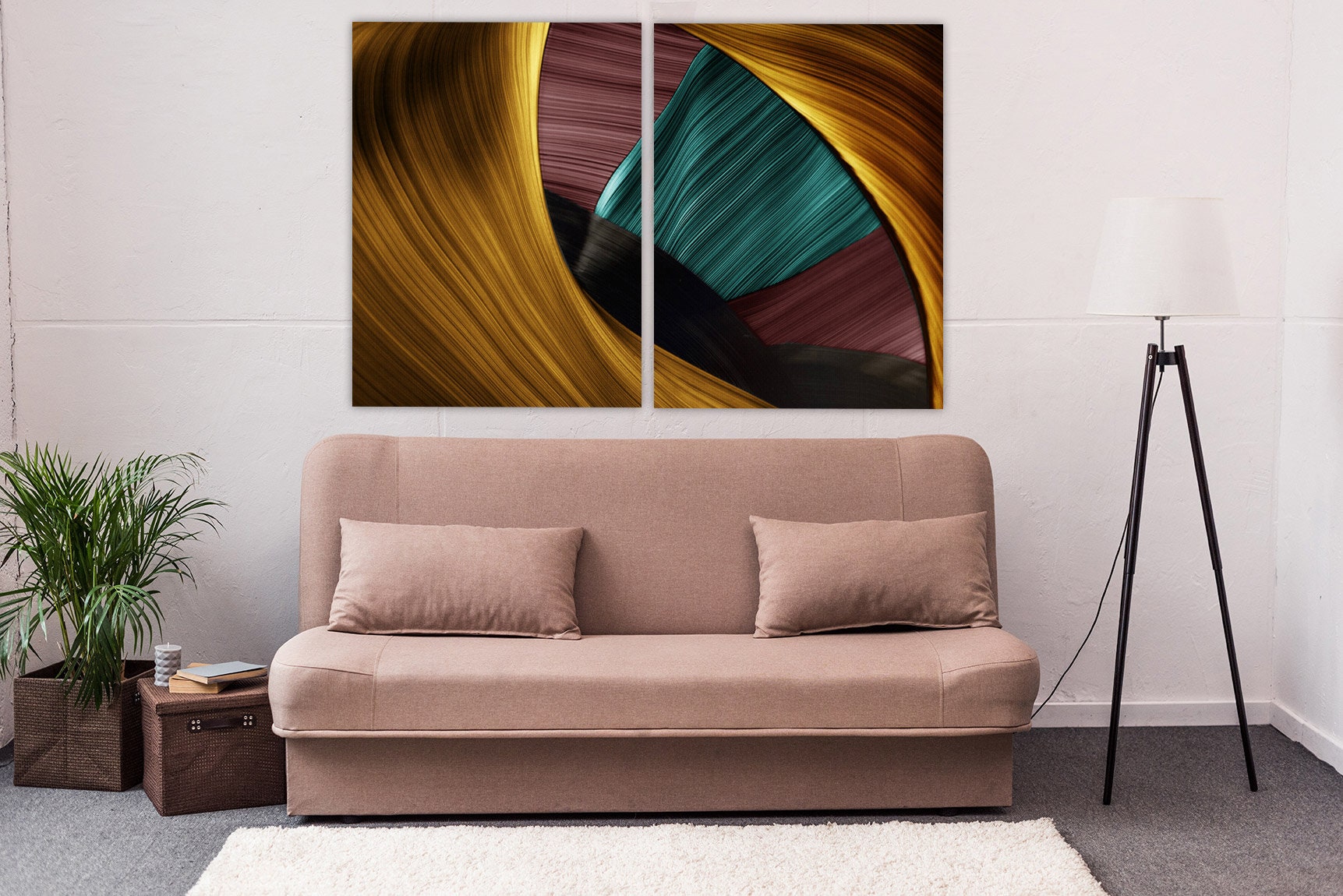 •Die Größe eines Gemäldesets, das aus mehreren Tafeln besteht, wird berechnet, indem die Tafeln zusammengezählt werden. Es wird empfohlen, solche Sets mit einem Abstand von 1–2 Zoll zwischen den Tafeln an der Wand anzubringen. Je größer die Bildelemente, desto größer ist der zulässige Abstand zwischen ihnen.