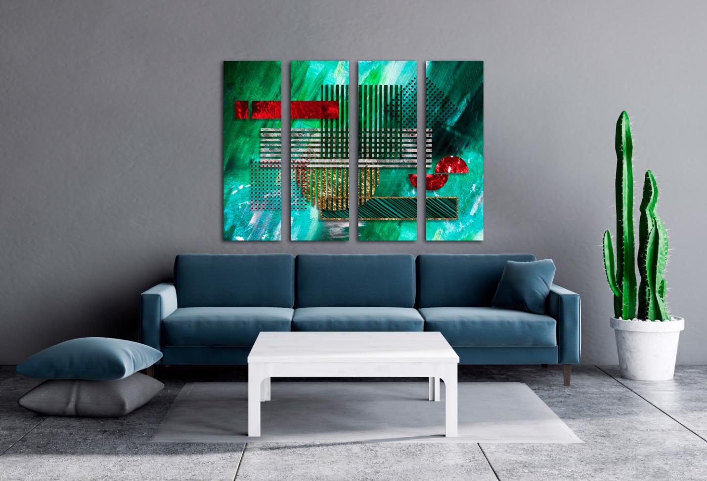 •Die Größe eines Gemäldesets, das aus mehreren Tafeln besteht, wird berechnet, indem die Tafeln addiert werden. Es wird empfohlen, solche Sets mit einem Abstand von 2,5–5 cm zwischen den Paneelen an der Wand zu platzieren. Je größer die Bildelemente, desto größer ist der zulässige Abstand zwischen ihnen.