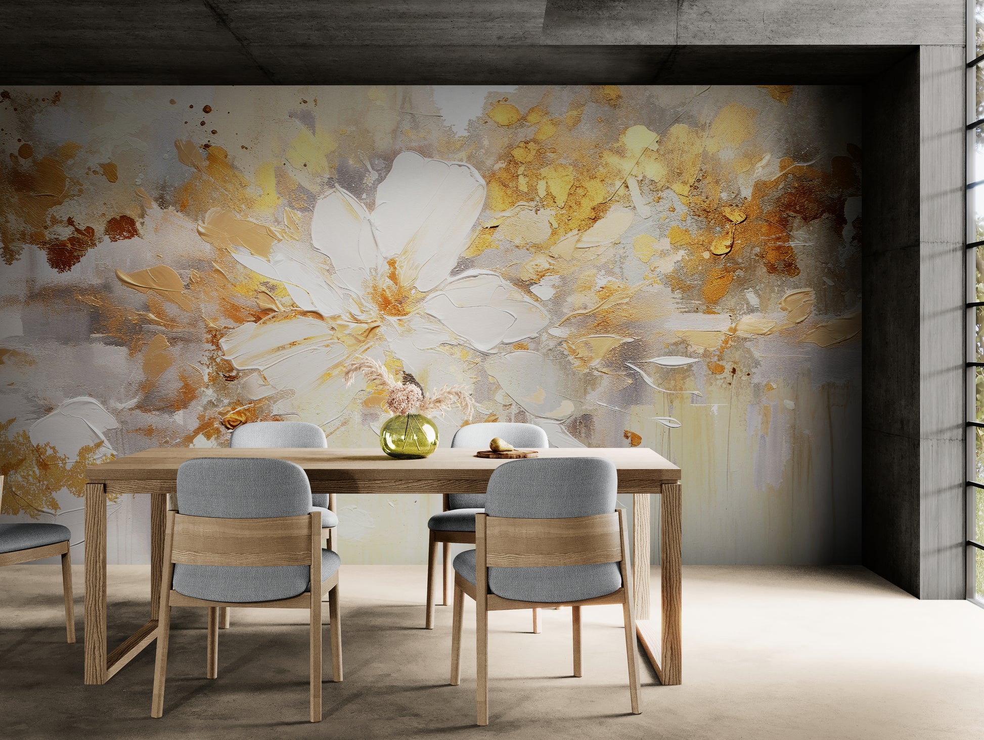 Blumentapete, abstraktes florales Wandbild, Tapete mit Ölgemälde-Effekt zum Abziehen und Aufkleben, selbstklebendes blau-goldenes Tapetenwandbild, abnehmbare Tapete, temporäres Akzentwandbild, Wohnzimmertapete