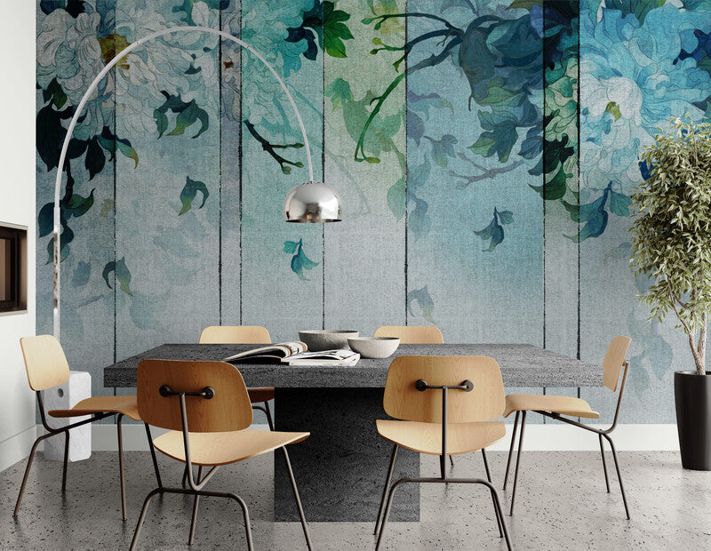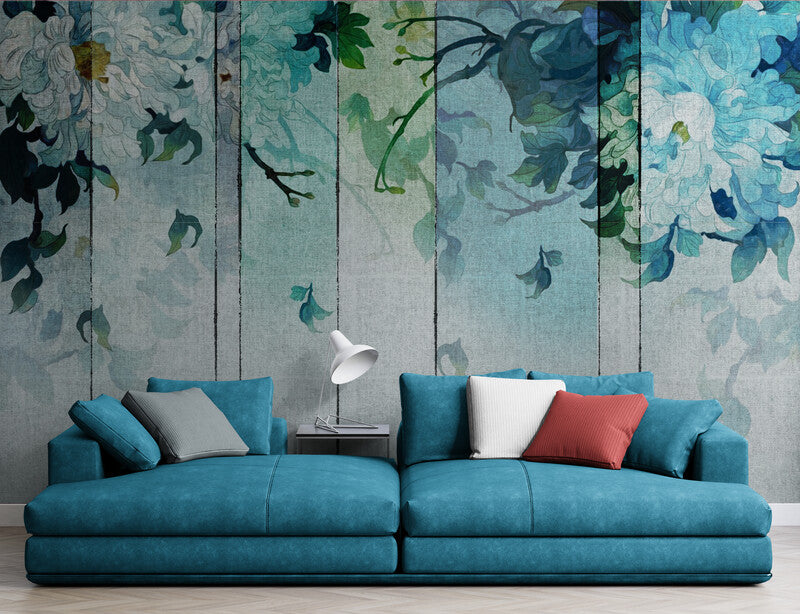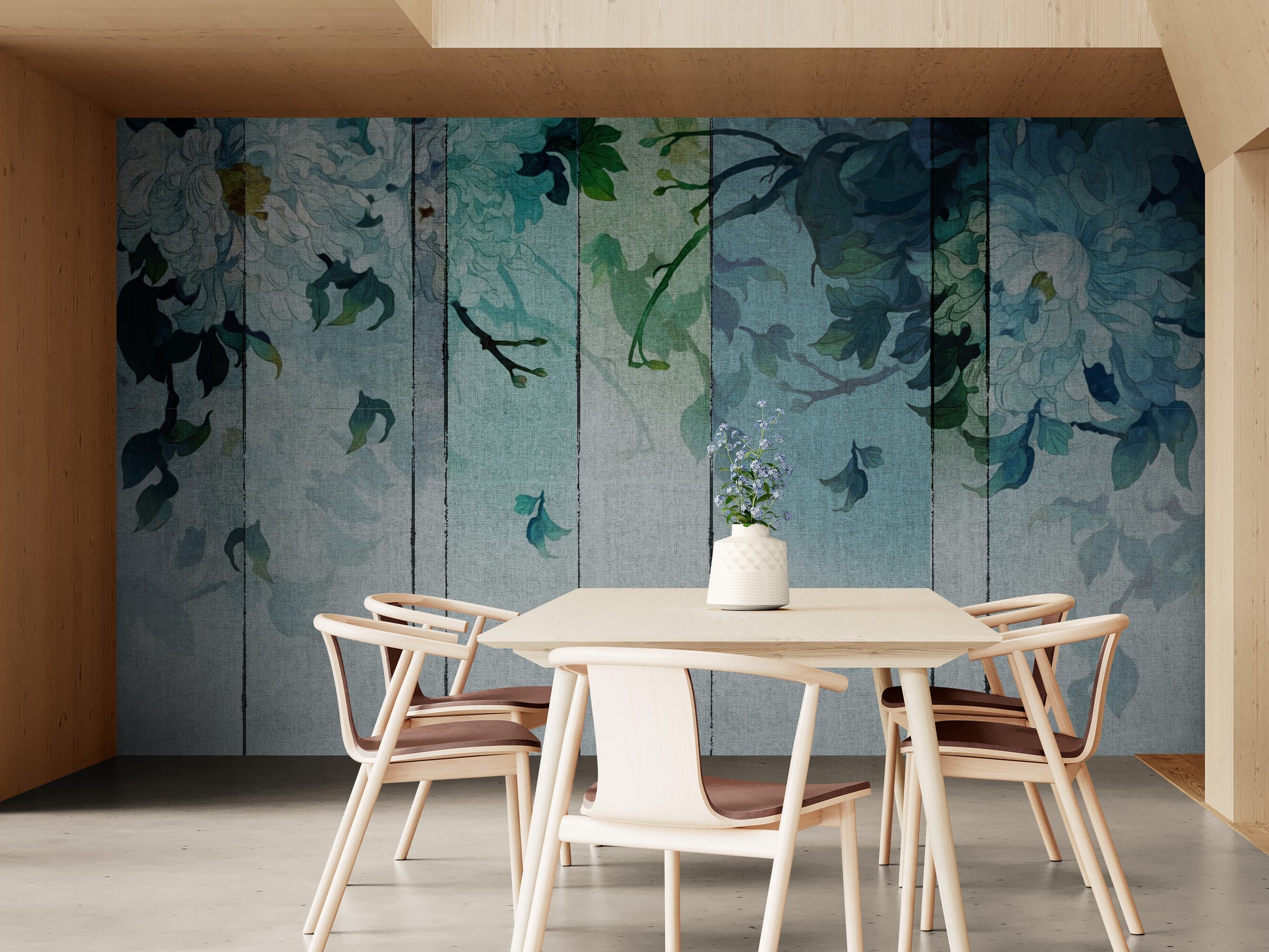 Tapete mit blauen Blumen, abstraktes Wandbild zum Abziehen und Aufkleben, Tapete mit zarten Blumen, extra große Wohnzimmertapete