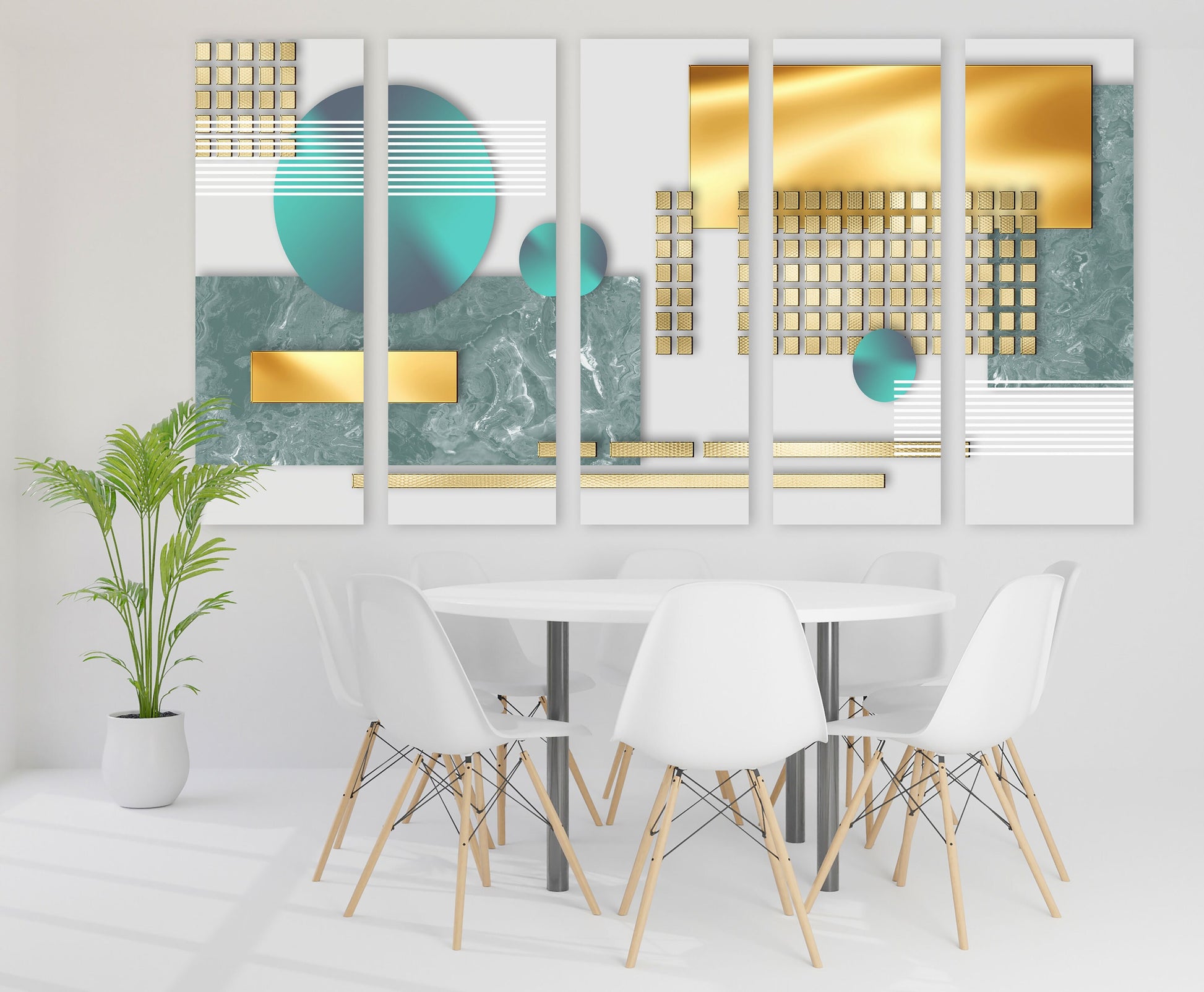 •Die Größe eines Gemäldesets, das aus mehreren Tafeln besteht, wird berechnet, indem die Tafeln zusammengezählt werden. Es wird empfohlen, solche Sets mit einem Abstand von 1–2 Zoll zwischen den Tafeln an der Wand anzubringen. Je größer die Bildelemente, desto größer ist der zulässige Abstand zwischen ihnen.
