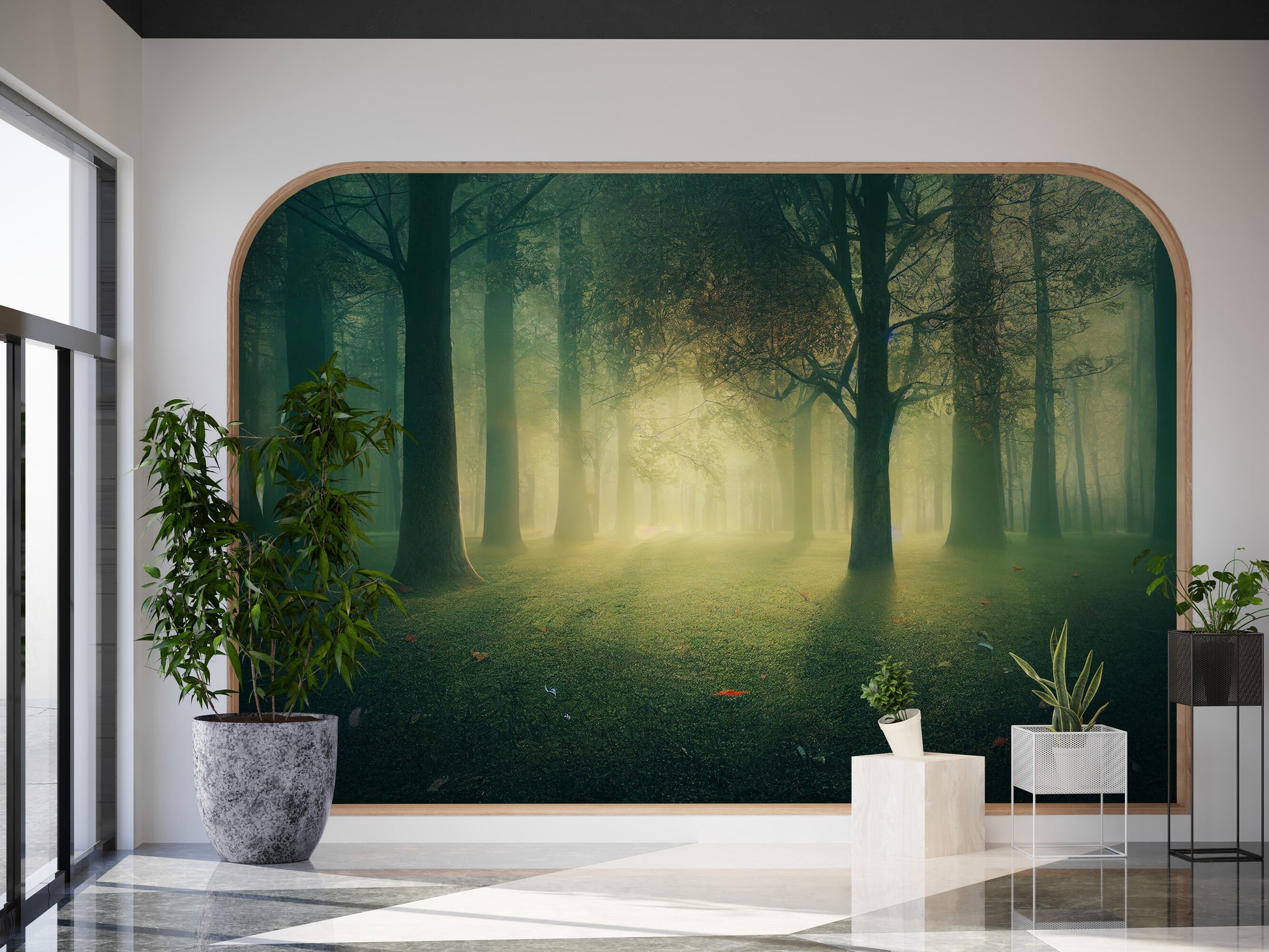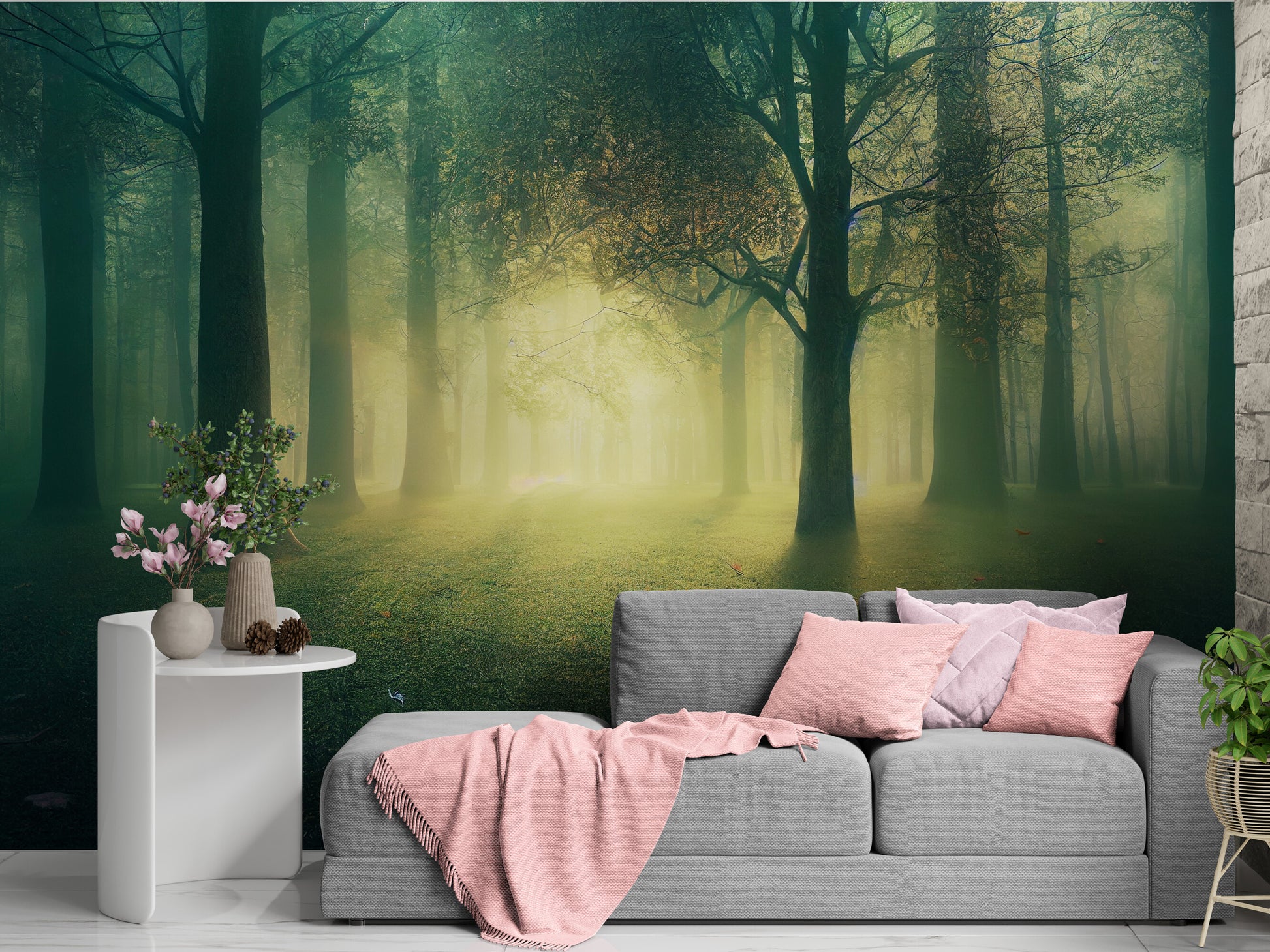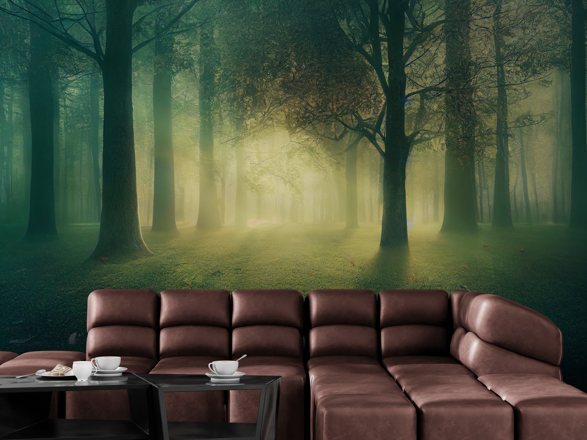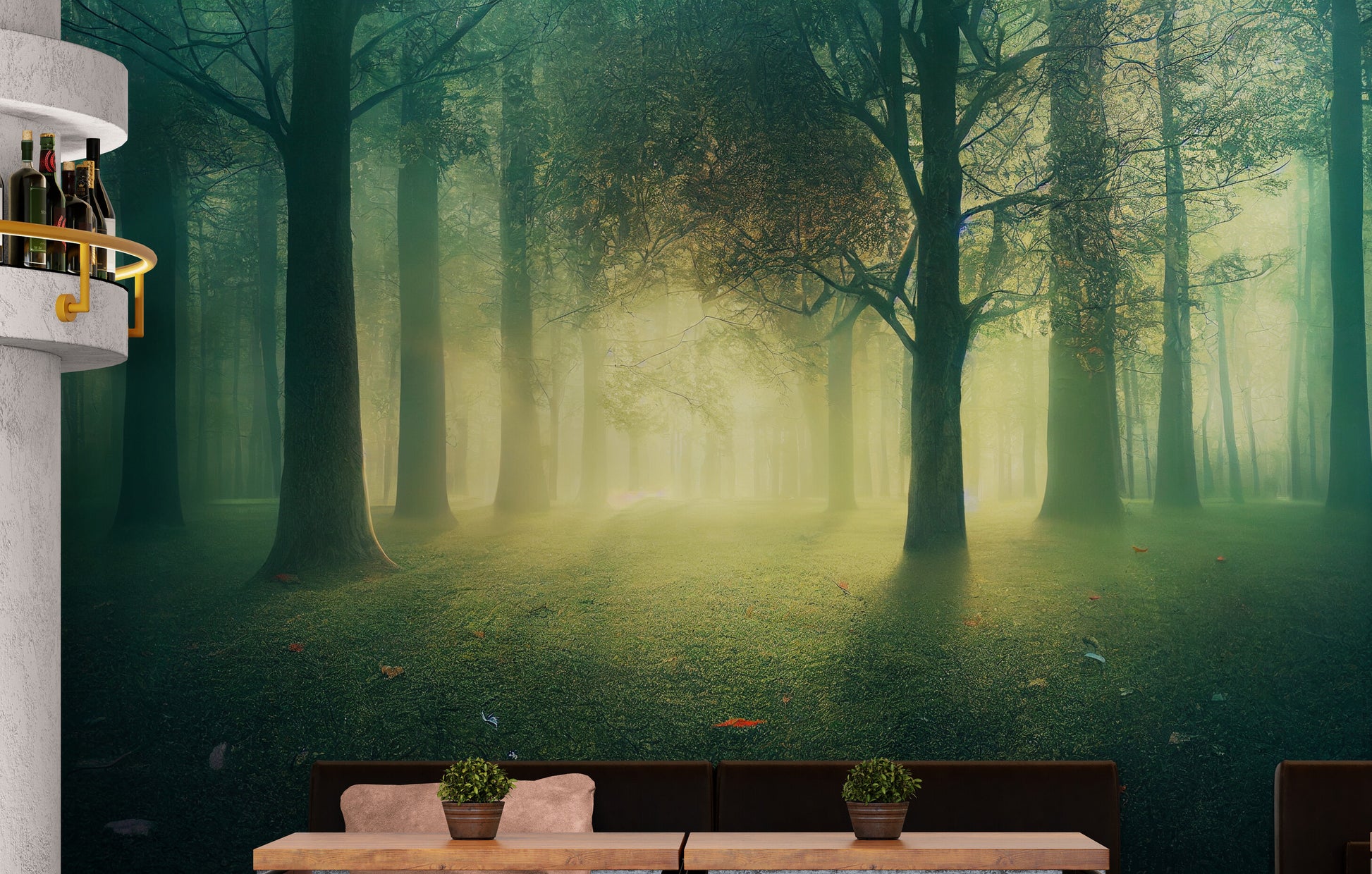 Selbstklebende Naturtapete, Grünes Waldwandbild, Selbstklebende Tontapete, Tapete mit Baumbild, Botanisches Wandbild, Temporäre Tapete