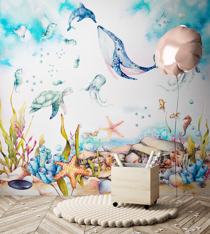 Extra große Kinderzimmertapete, selbstklebendes Wandbild für Kinder mit Unterwasserwelt, Abzieh- und Klebetapete, Akzenttapete fürs Kinderzimmer