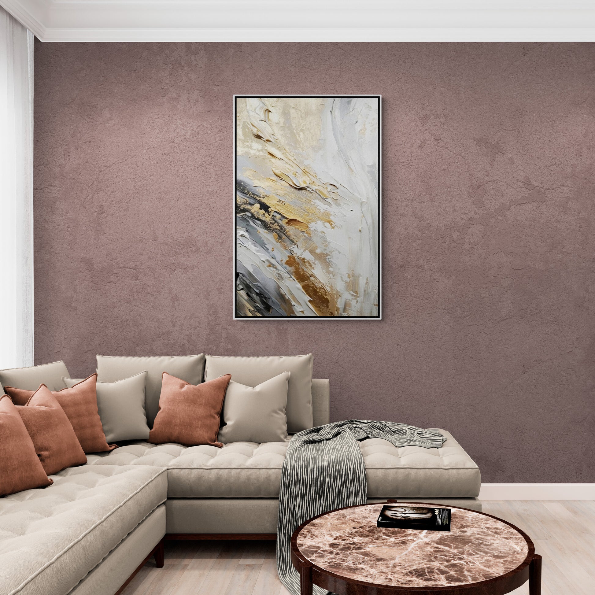 Dieses abstrakte Wandbild in Gold und Grau, ein gerahmter, moderner Leinwanddruck, ein Ölgemälde als Wandbild und ein Geschenk für Männer, trägt maßgeblich zur Atmosphäre und dem Charakter Ihres Interieurs bei. Das Bild verleiht jedem Raum Schönheit, Tiefe und Persönlichkeit. Der Druck kann zum zentralen Akzent im Raum werden, der die Blicke auf sich zieht und das Interesse der Besucher weckt.
