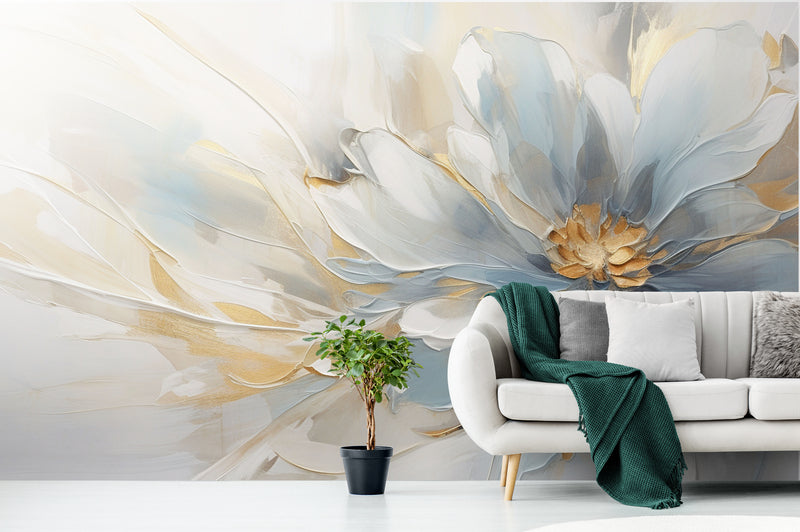 Extra große Blumentapete, Blumen Wandbild zum Abziehen und Aufkleben, blau-goldene Tapete selbstklebend, botanisches abnehmbares Wandbild, Schlafzimmertapete