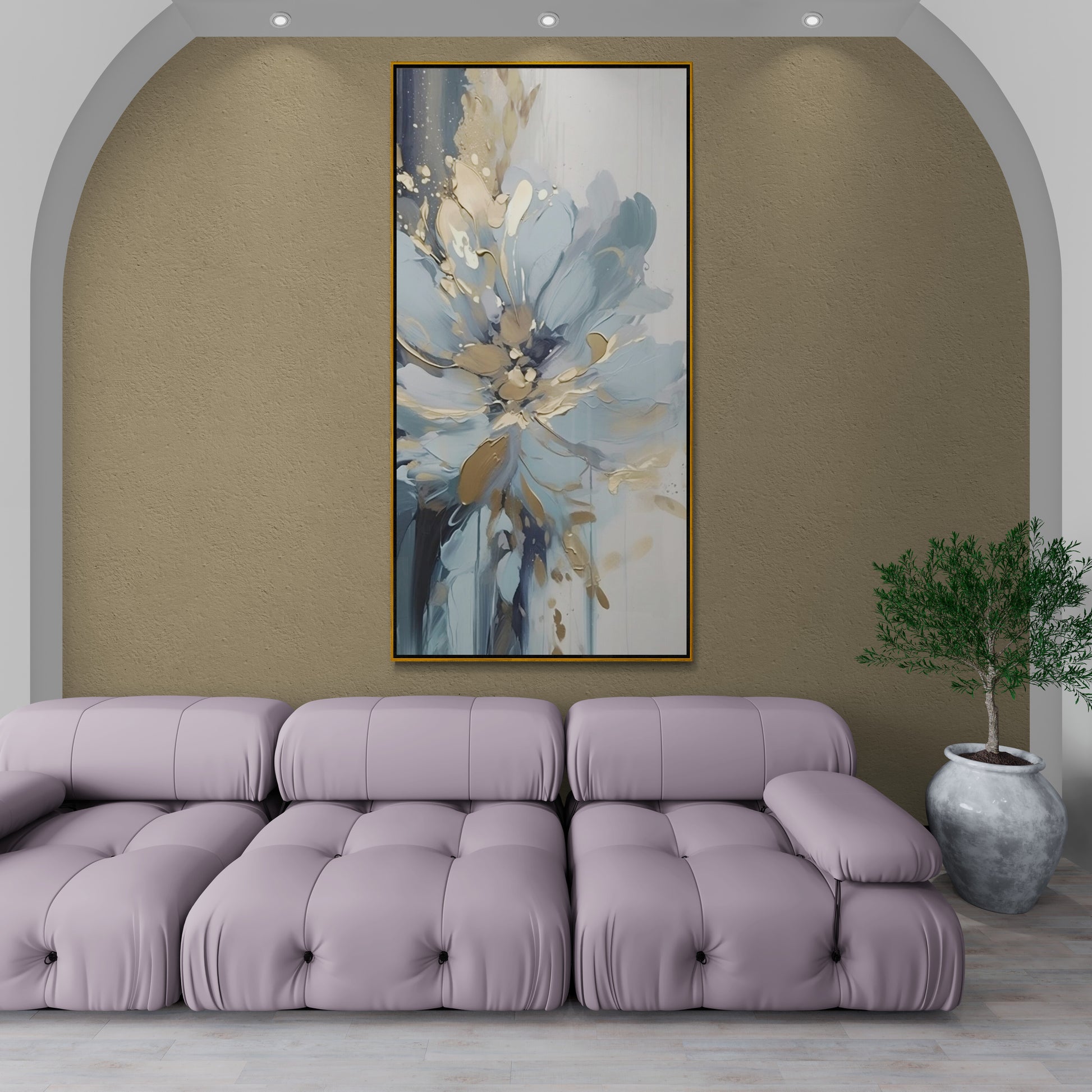 Blaue Blumen-Wandbilder, große gerahmte blau-goldene Wandkunst, abstrakte Floating-Frame-Kunstwerke, ruhige Schlafzimmer-Leinwanddrucke und druckbare Blumenkunstwerke verleihen dem Interieur einen besonderen und ungewöhnlichen Look und bringen visuelle Dynamik und moderne Stilakzente. Sie erhalten das Bild fertig, sodass Sie keine zusätzliche Zeit mit dem Aufhängen verschwenden müssen. Gerahmte Leinwand ist ein ideales Geschenk.