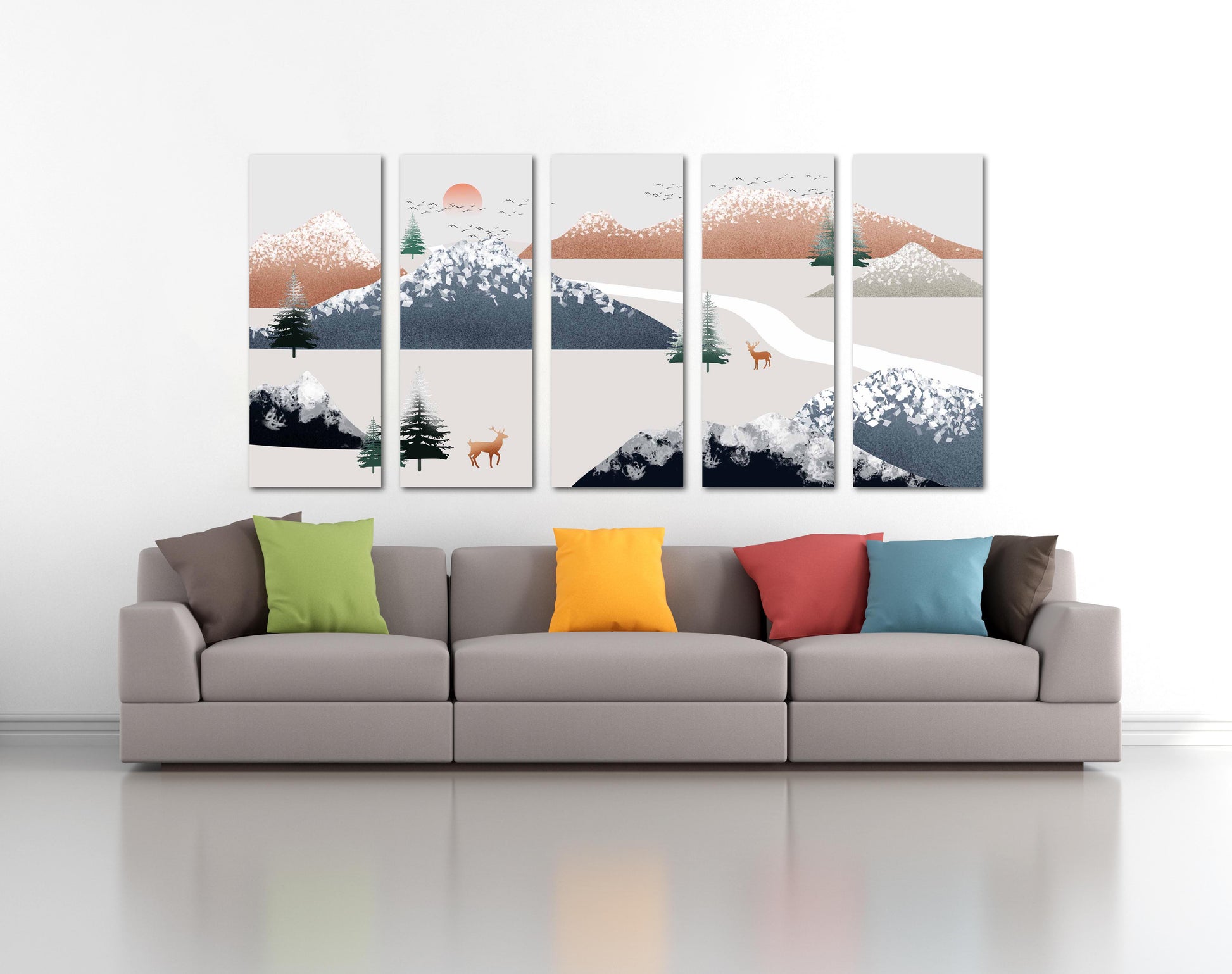 • Die Größe eines Gemäldesets, das aus mehreren Tafeln besteht, wird berechnet, indem die Tafeln zusammengezählt werden. Es wird empfohlen, solche Sets mit einem Abstand von 1–2 Zoll zwischen den Tafeln an die Wand zu hängen. Je größer die Bildelemente sind, desto größer ist der zulässige Abstand zwischen ihnen.