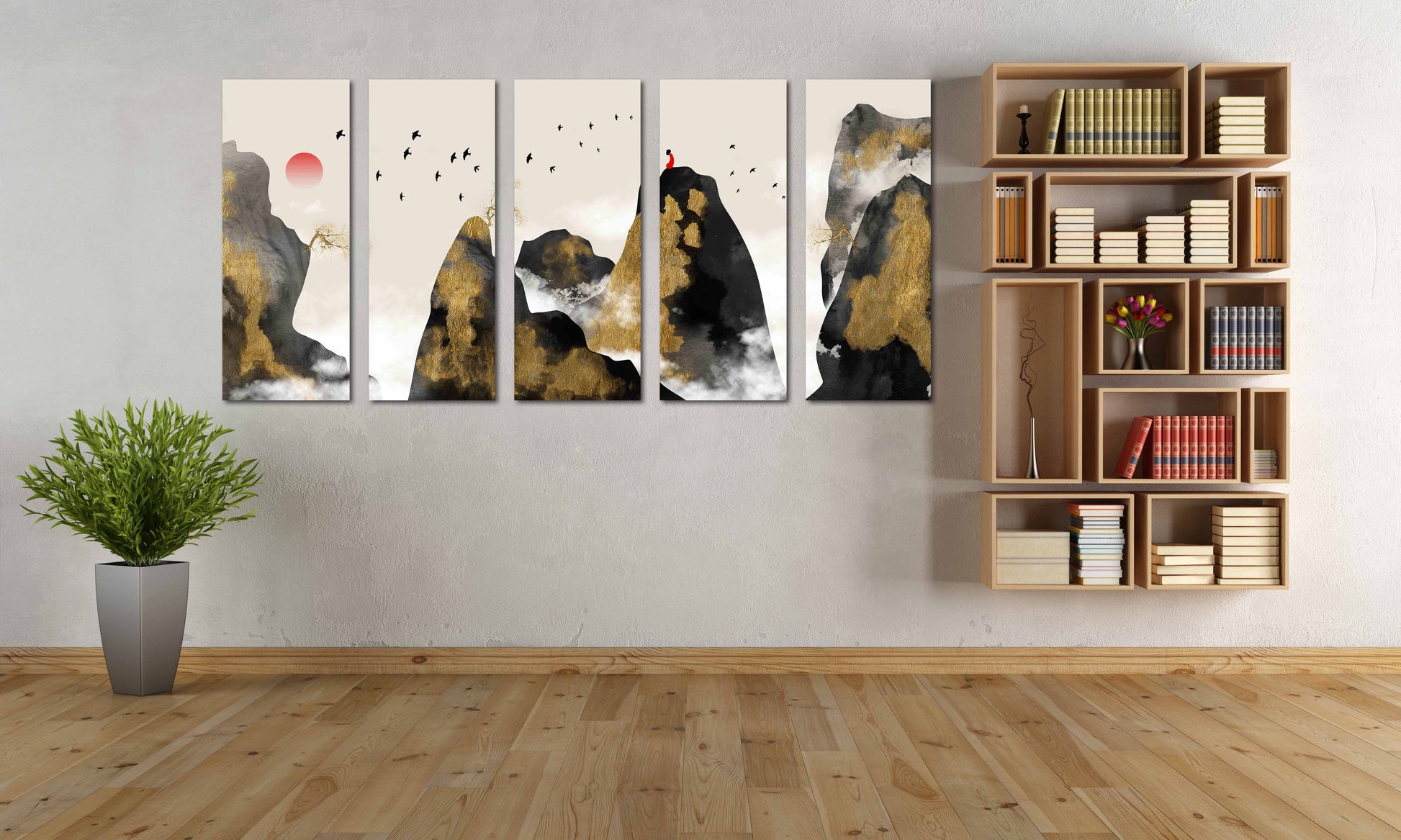•Die Größe eines Gemäldesets, das aus mehreren Tafeln besteht, wird berechnet, indem die Tafeln zusammengezählt werden. Es wird empfohlen, solche Sets mit einem Abstand von 1–2 Zoll zwischen den Tafeln an der Wand anzubringen. Je größer die Bildelemente, desto größer ist der zulässige Abstand zwischen ihnen.