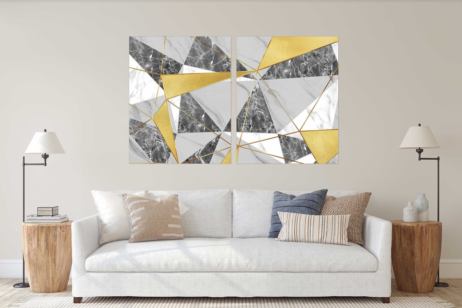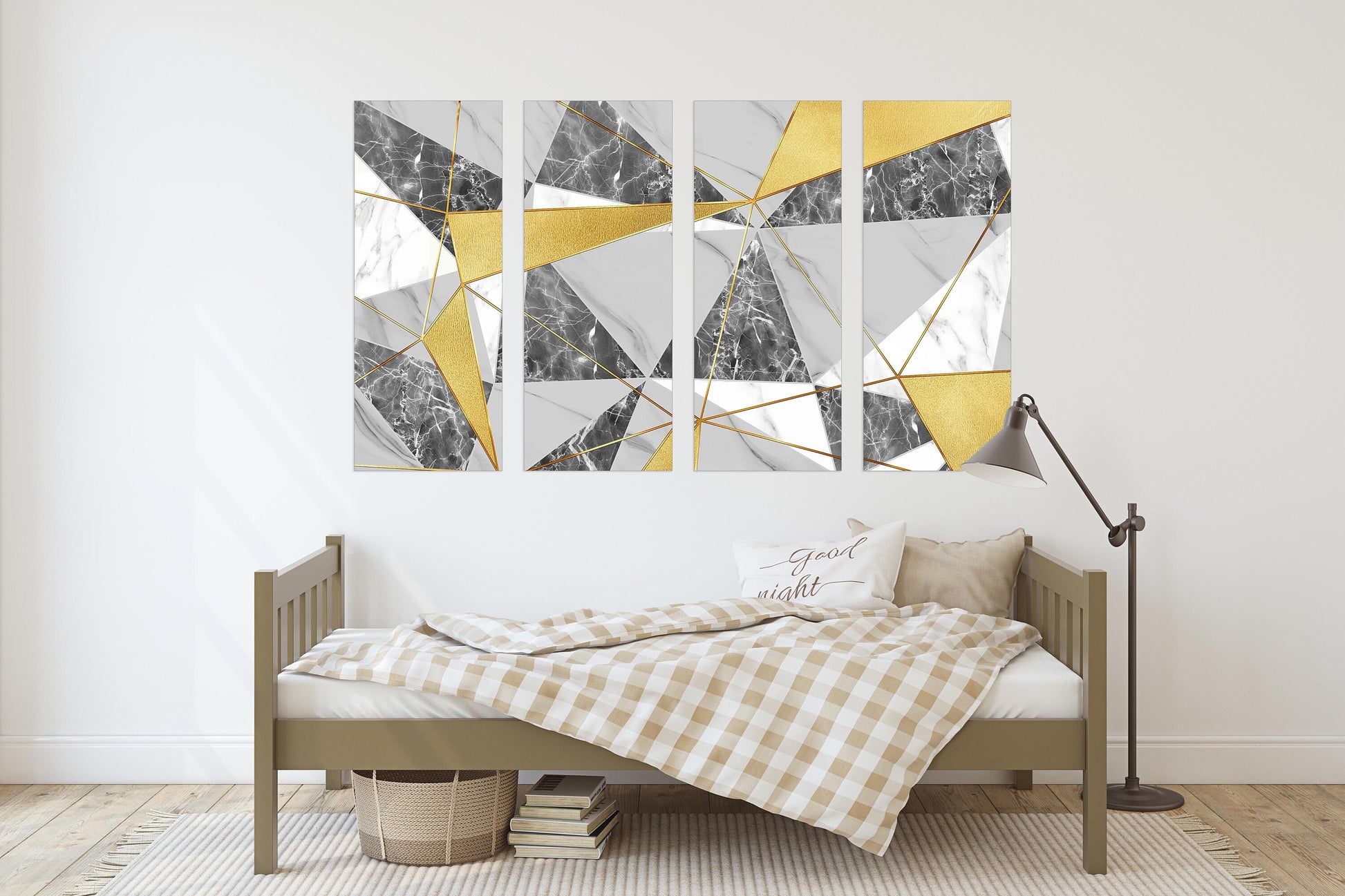•Die Größe eines Gemäldesets, das aus mehreren Tafeln besteht, wird berechnet, indem die Tafeln zusammengezählt werden. Es wird empfohlen, solche Sets mit einem Abstand von 1–2 Zoll zwischen den Tafeln an der Wand anzubringen. Je größer die Bildelemente, desto größer ist der zulässige Abstand zwischen ihnen.