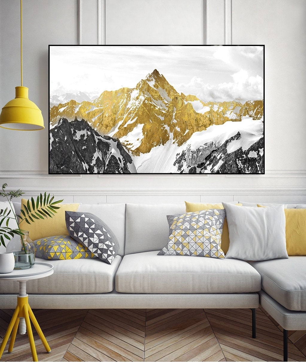 Goldene Berge Leinwand Wandkunst, Gold Floater Rahmen druckbares Kunstwerk, großer Natur Leinwanddruck, Landschaft Wandkunst, Geschenk zur Wohnungserwärmung