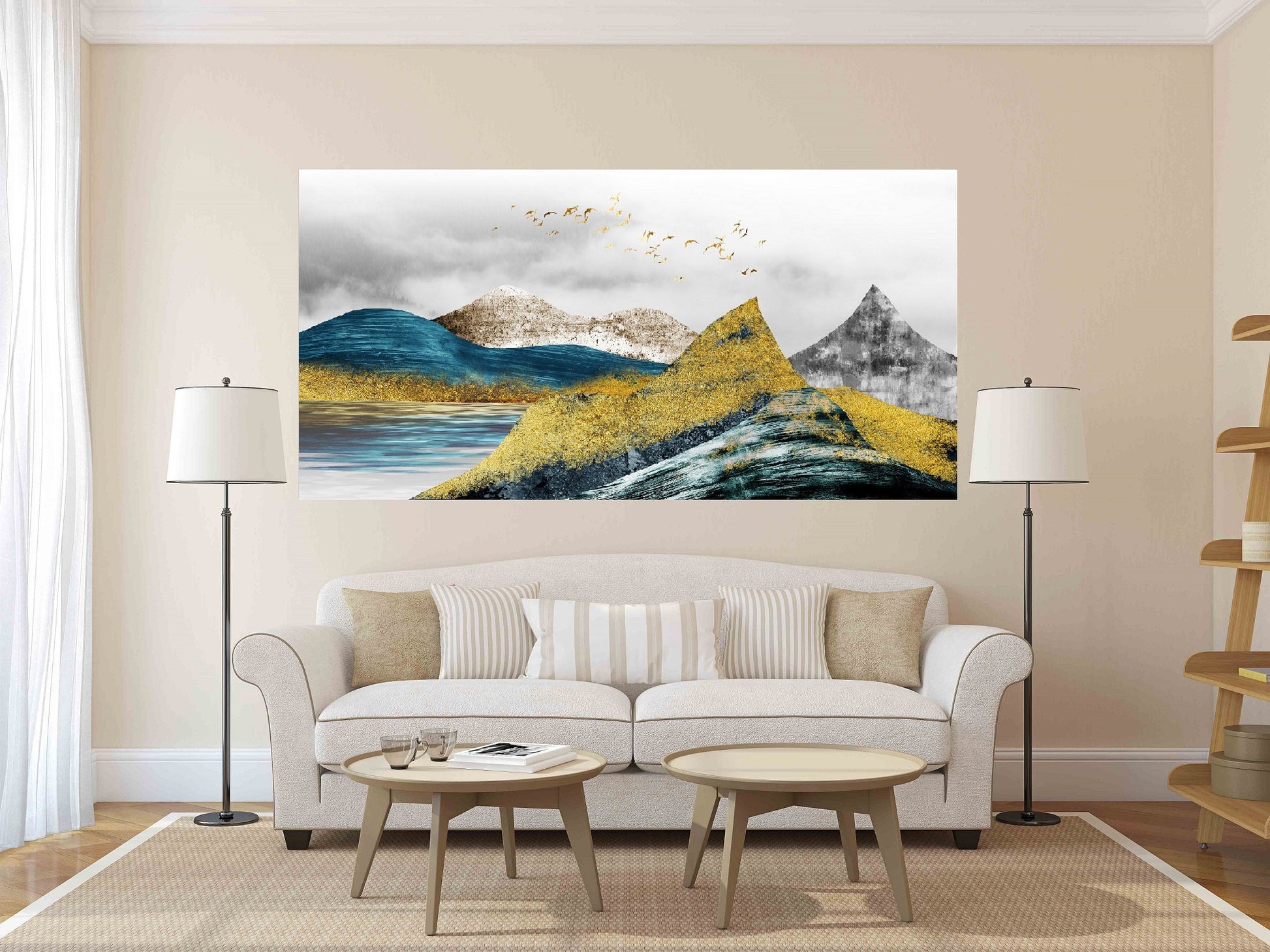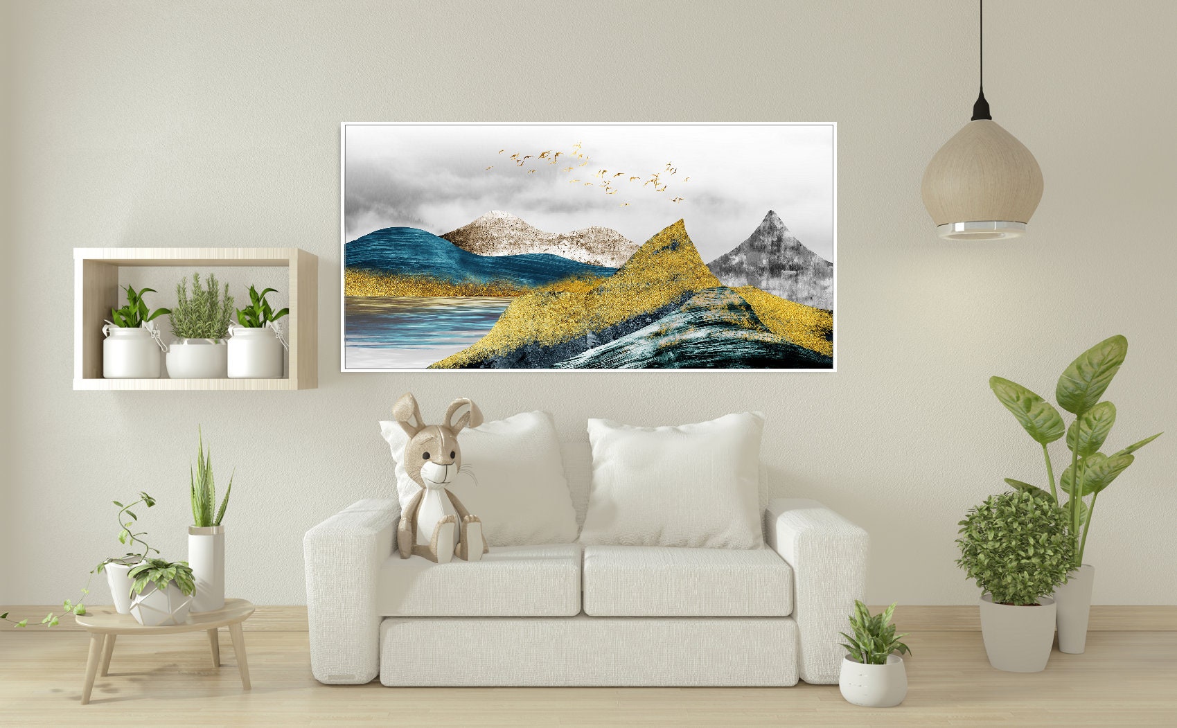 Goldene Berge gerahmte Wandkunst, druckbares Landschaftskunstwerk im Floater-Rahmen, großer blau-goldener Leinwanddruck, Wohnzimmer-Leinwandkunst