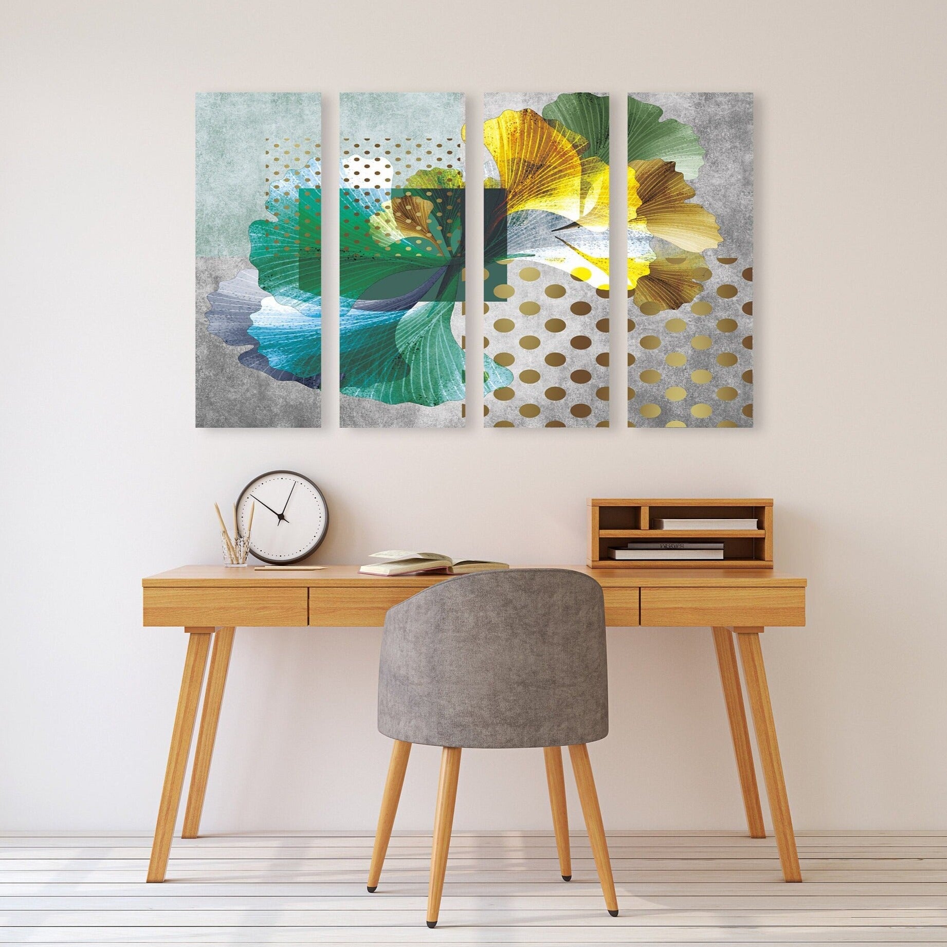 •Die Größe eines Gemäldesets, das aus mehreren Tafeln besteht, wird berechnet, indem die Tafeln zusammengezählt werden. Es wird empfohlen, solche Sets mit einem Abstand von 1–2 Zoll zwischen den Tafeln an der Wand anzubringen. Je größer die Bildelemente, desto größer ist der zulässige Abstand zwischen ihnen.