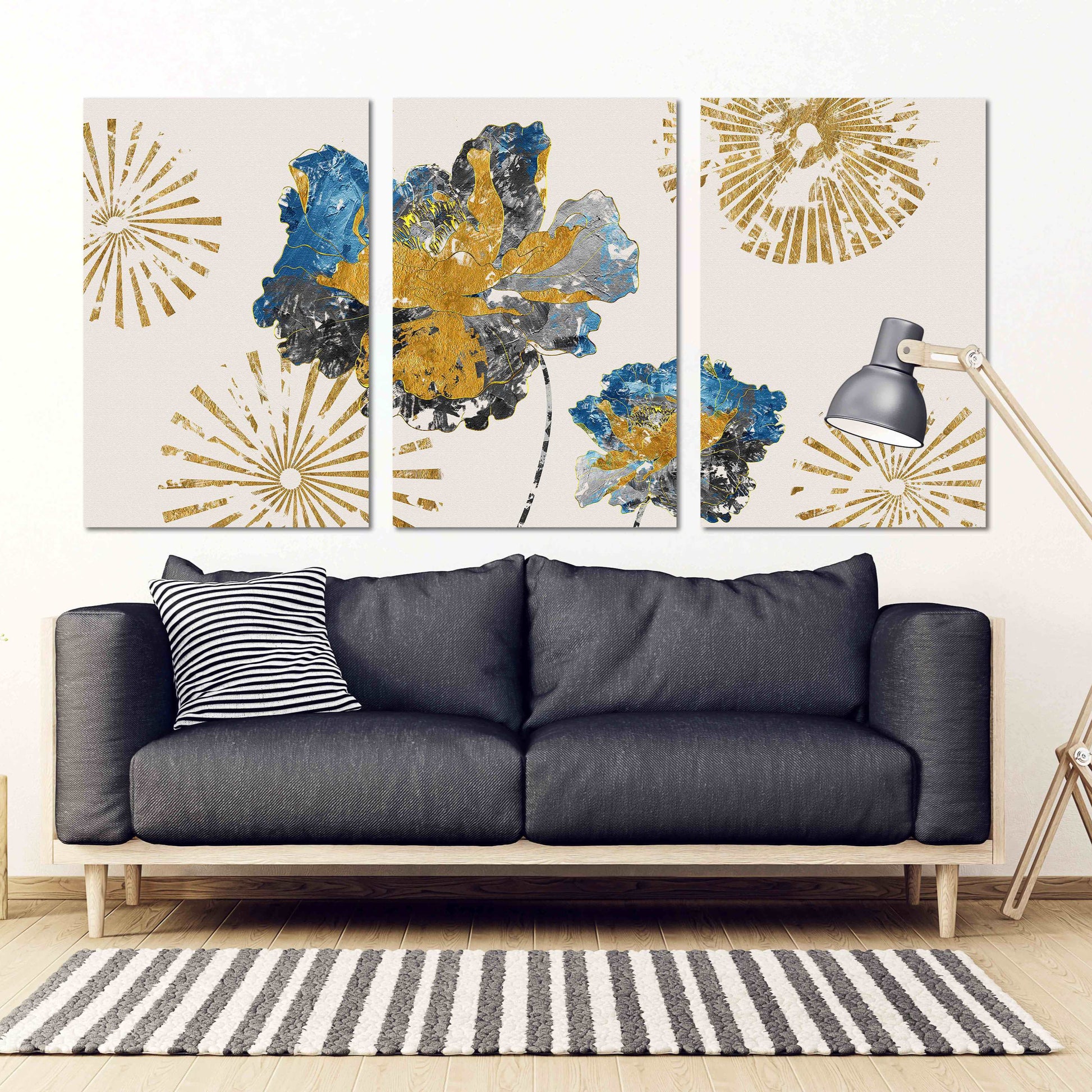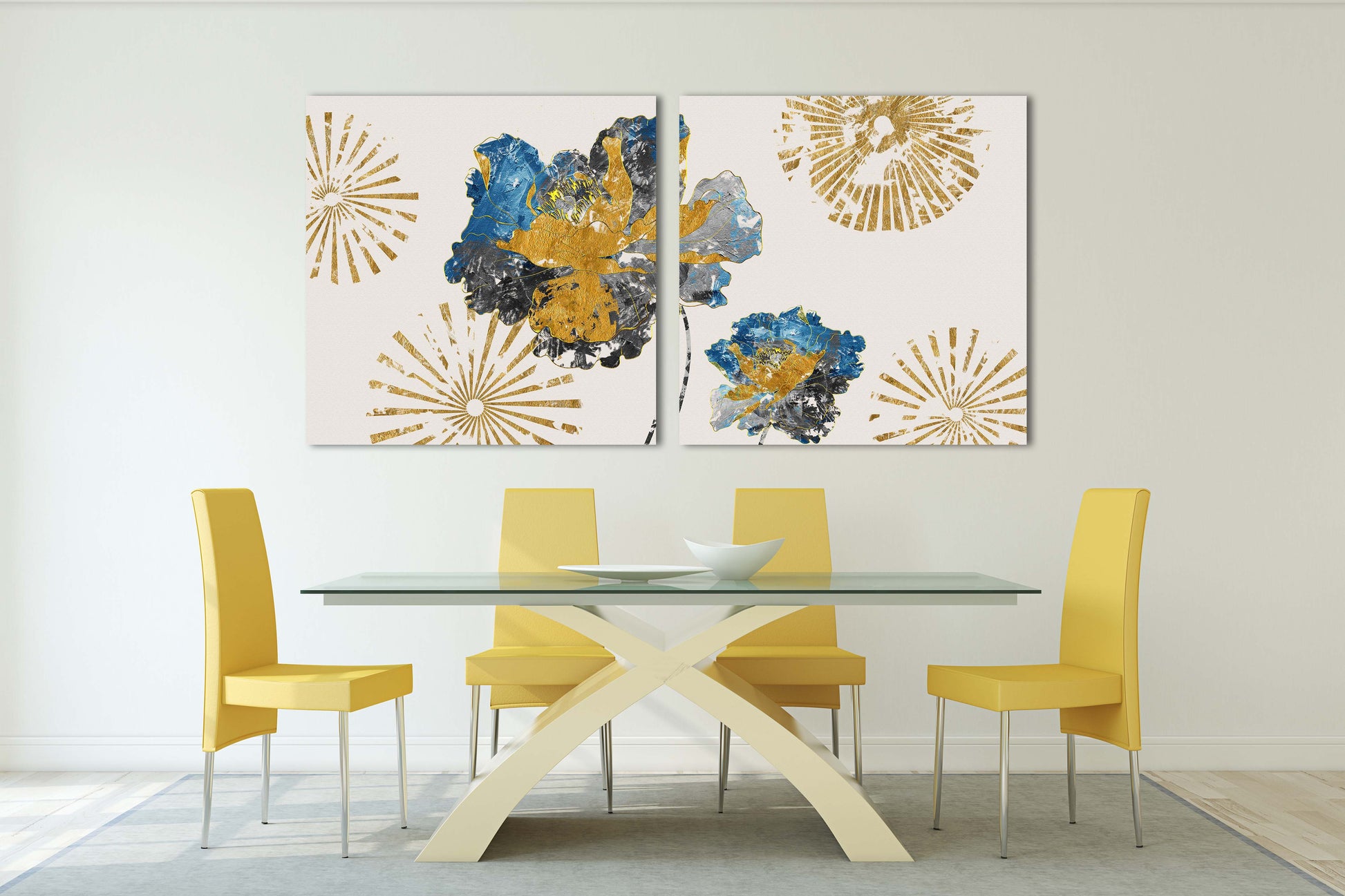 •Die Größe eines Gemäldesets, das aus mehreren Tafeln besteht, wird berechnet, indem die Tafeln zusammengezählt werden. Es wird empfohlen, solche Sets mit einem Abstand von 1–2 Zoll zwischen den Tafeln an der Wand anzubringen. Je größer die Bildelemente, desto größer ist der zulässige Abstand zwischen ihnen.