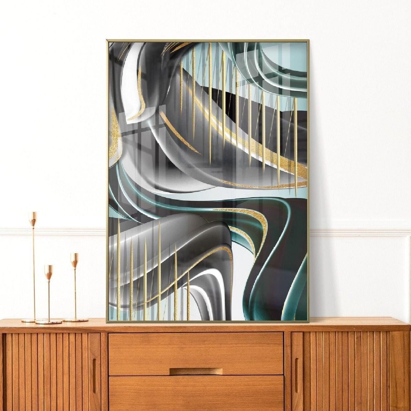 Großes abstraktes gerahmtes Wandbild, schwarz-goldener Leinwanddruck, druckbares Kunstwerk im Floater-Rahmen mit Wellen und Streifen, Wandbild fürs Wohnzimmer