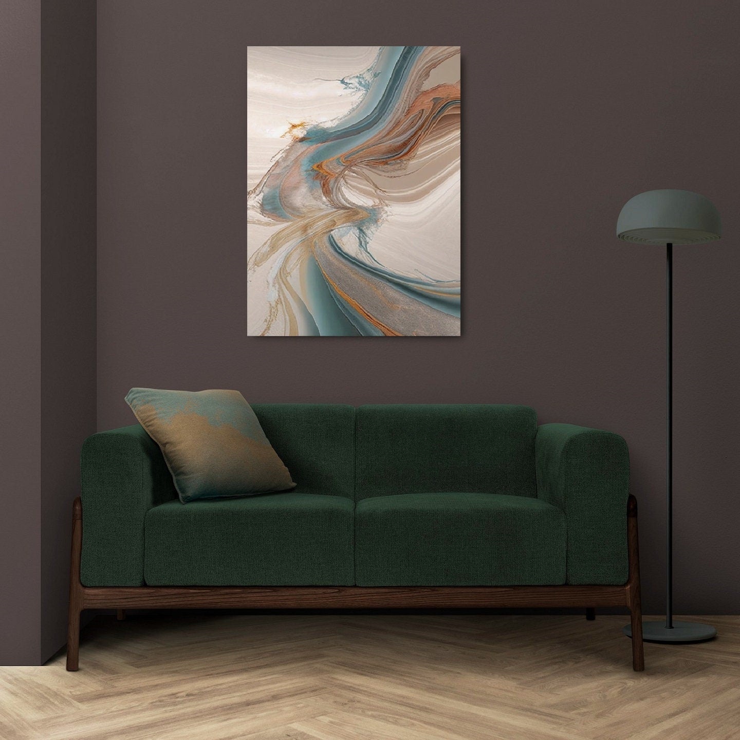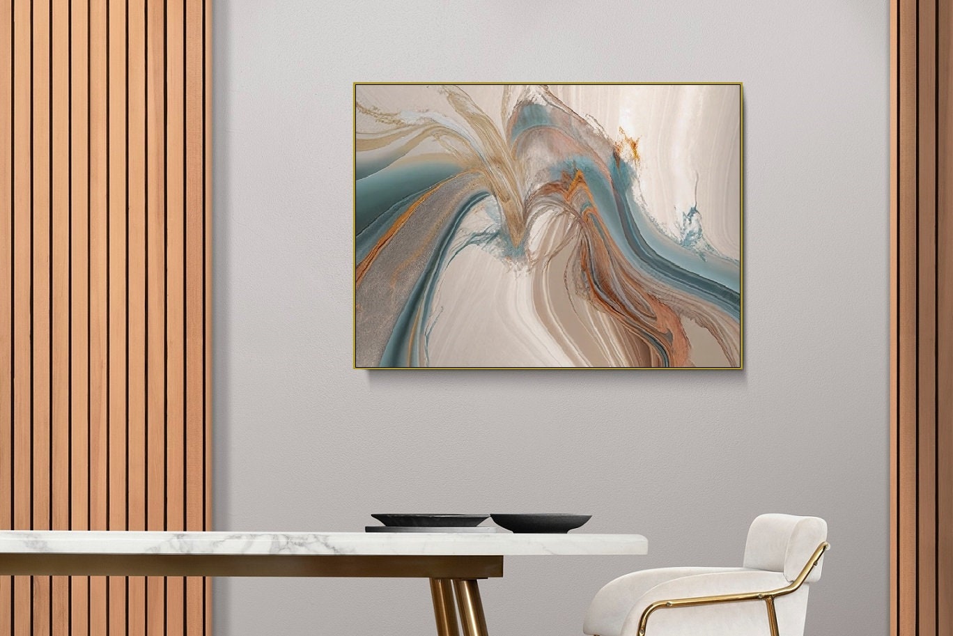 Großes abstraktes Wandbild, großes Wandbild im Float-Rahmen, blau-beiges Leinwandbild, zeitgenössisches gerahmtes Wandbild, minimalistisches Schlafzimmer-Kunstwerk