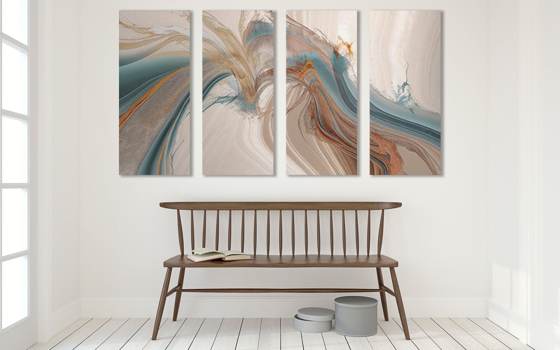 • Die Größe eines Gemäldesets, das aus mehreren Tafeln besteht, ergibt sich aus der Addition der Tafeln. Es wird empfohlen, solche Sets mit einem Abstand von 2,5–5 cm zwischen den Tafeln an der Wand zu platzieren. Je größer die Bildelemente sind, desto größer ist der zulässige Abstand zwischen ihnen.