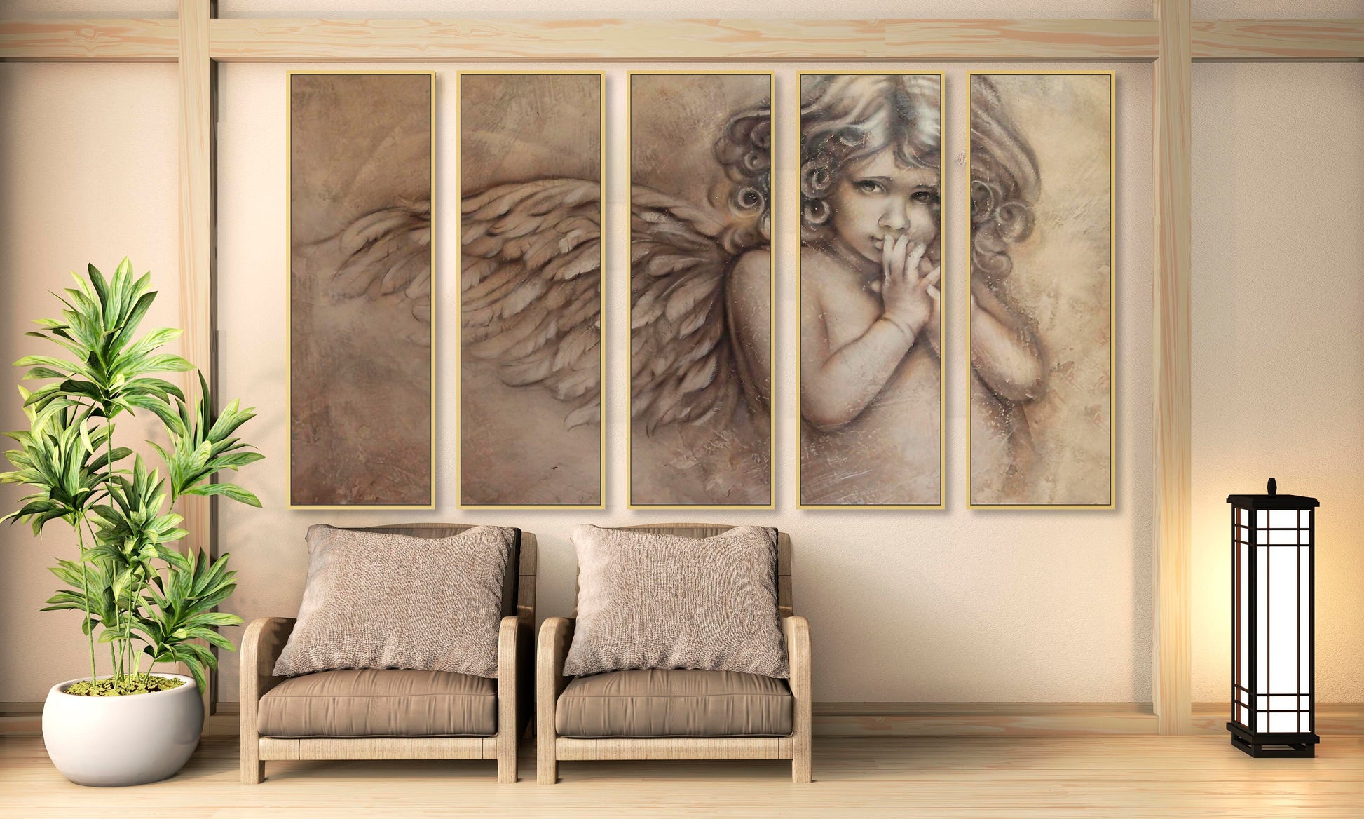 Großes Engel-Wandbild auf Leinwand, religiöses gerahmtes Gemälde auf Leinwand, druckbares mehrteiliges Engel-Kunstwerk im Floater-Rahmen, hängende Wanddekoration