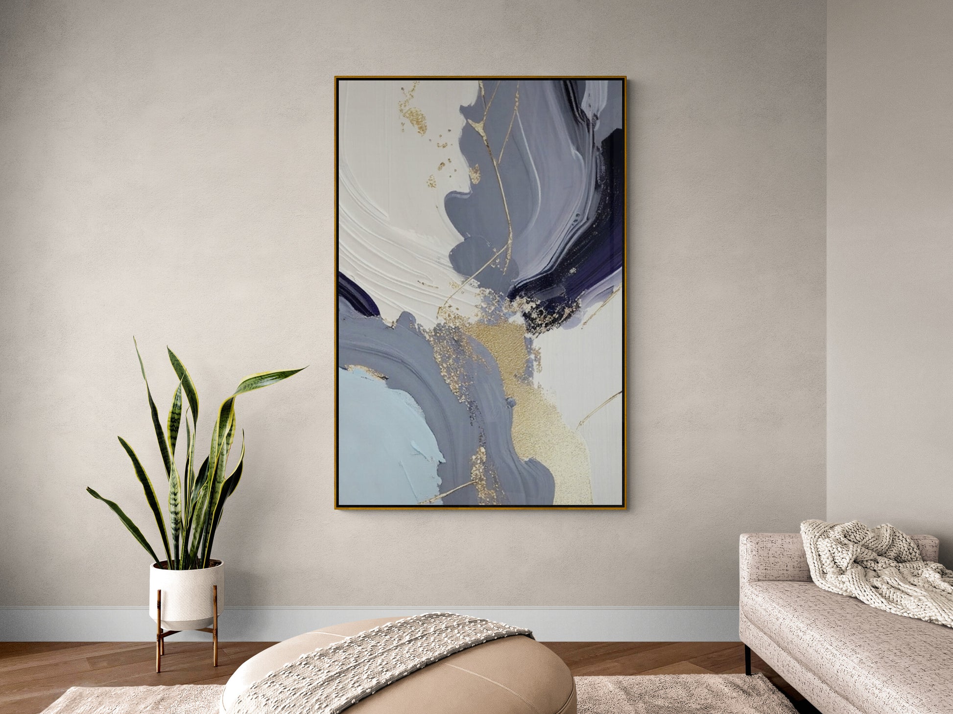 Große abstrakte Wandkunst, blauer Leinwanddruck mit schwebendem Rahmen, druckbares Wanddekor, Kunstwerk im Aluminiumrahmen, moderne Wandkunst für das Wohnzimmer