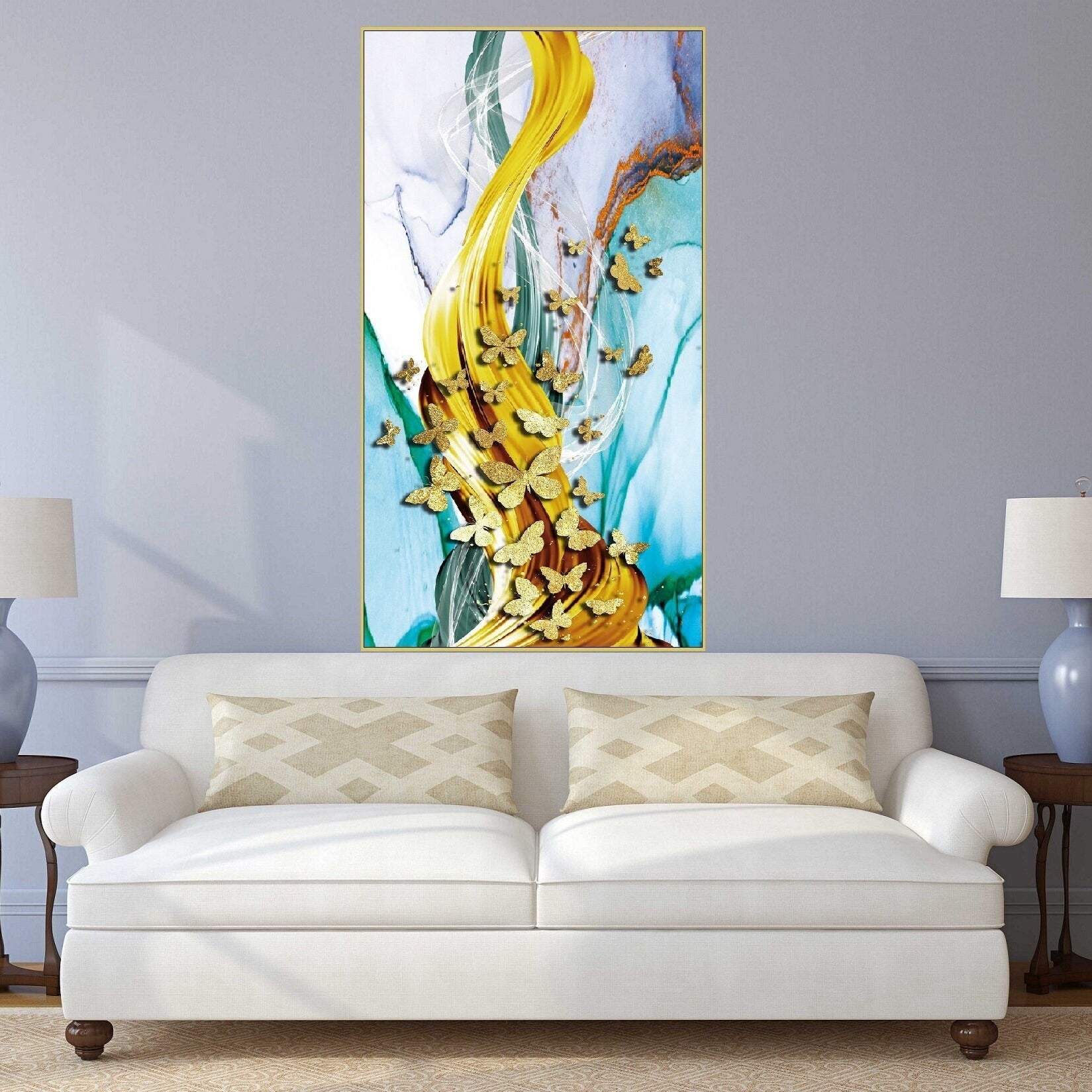 Großes Schmetterlings-Wandbild, abstraktes Kunstwerk im Floater-Rahmen, goldener Schmetterlings-Leinwanddruck, gerahmtes Wohnzimmer-Wandbild, farbenfrohes Kunstwerk