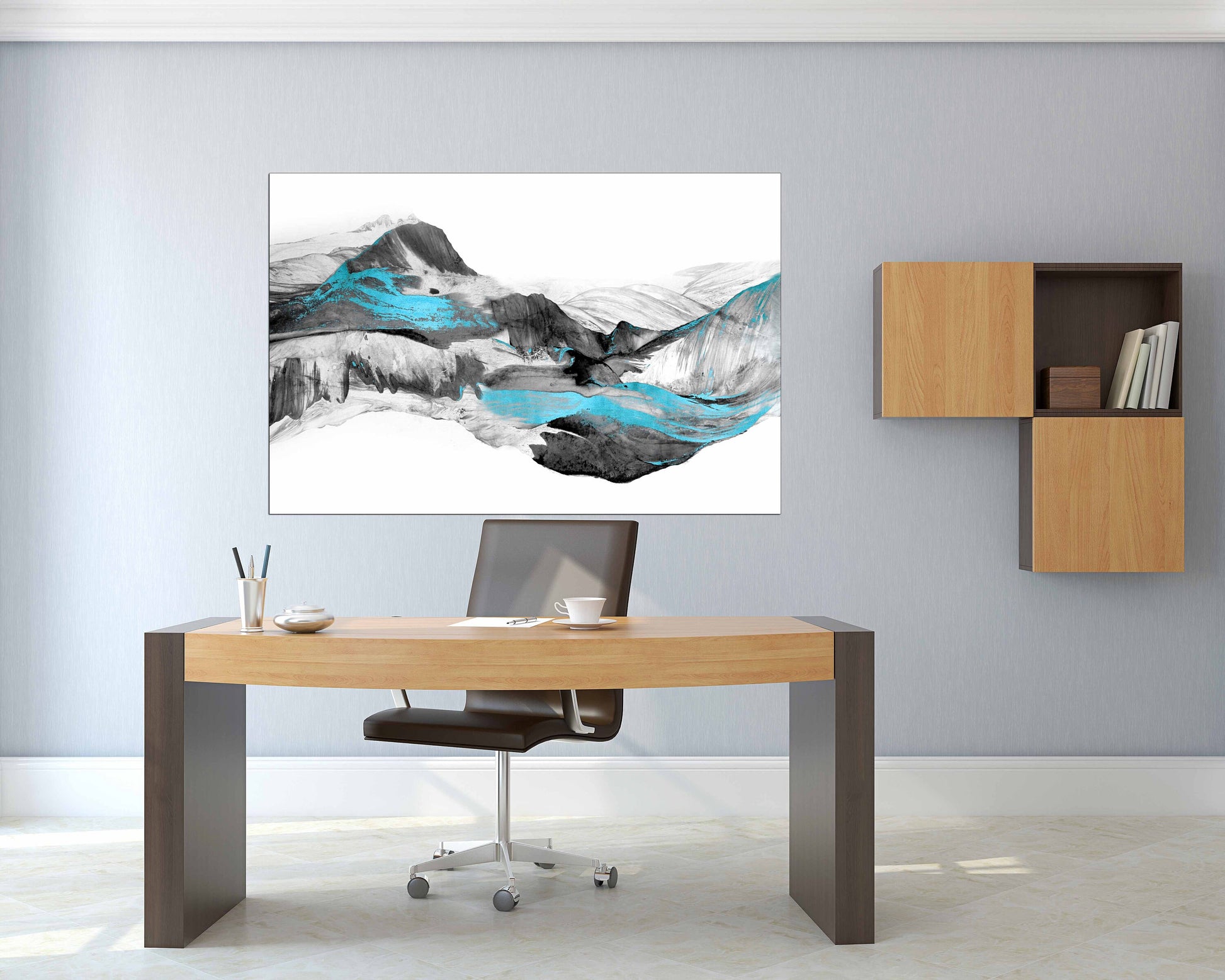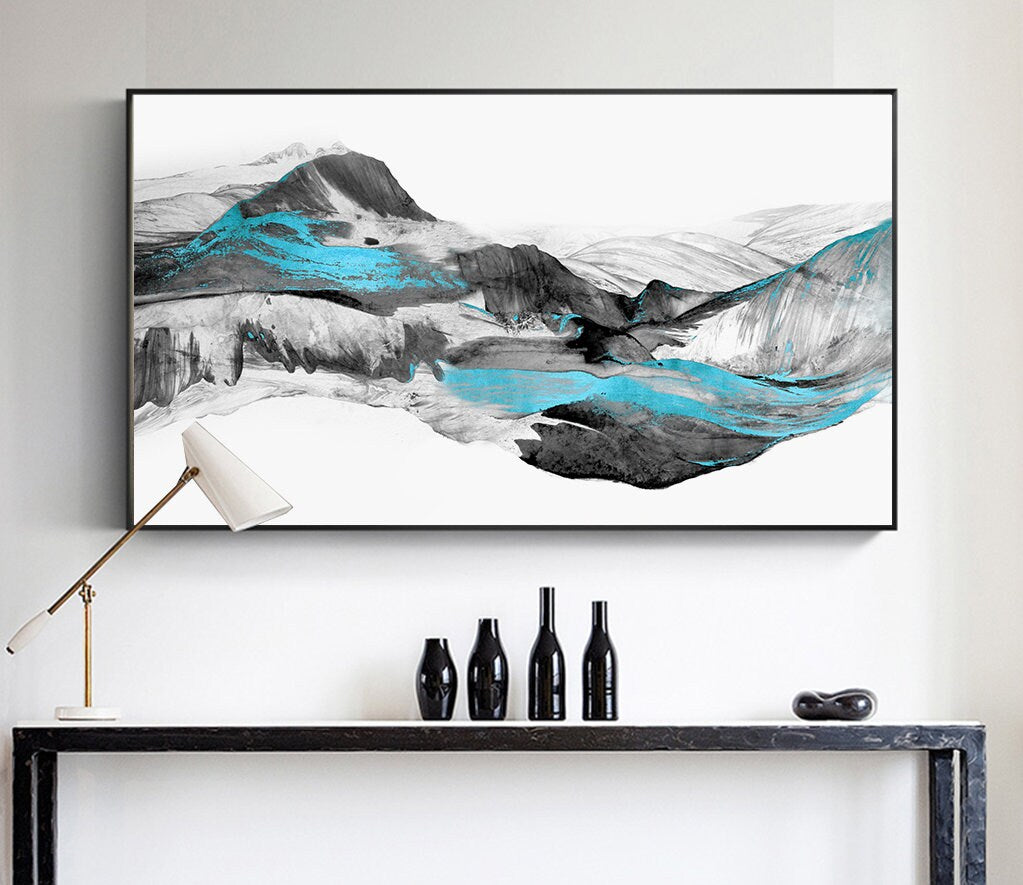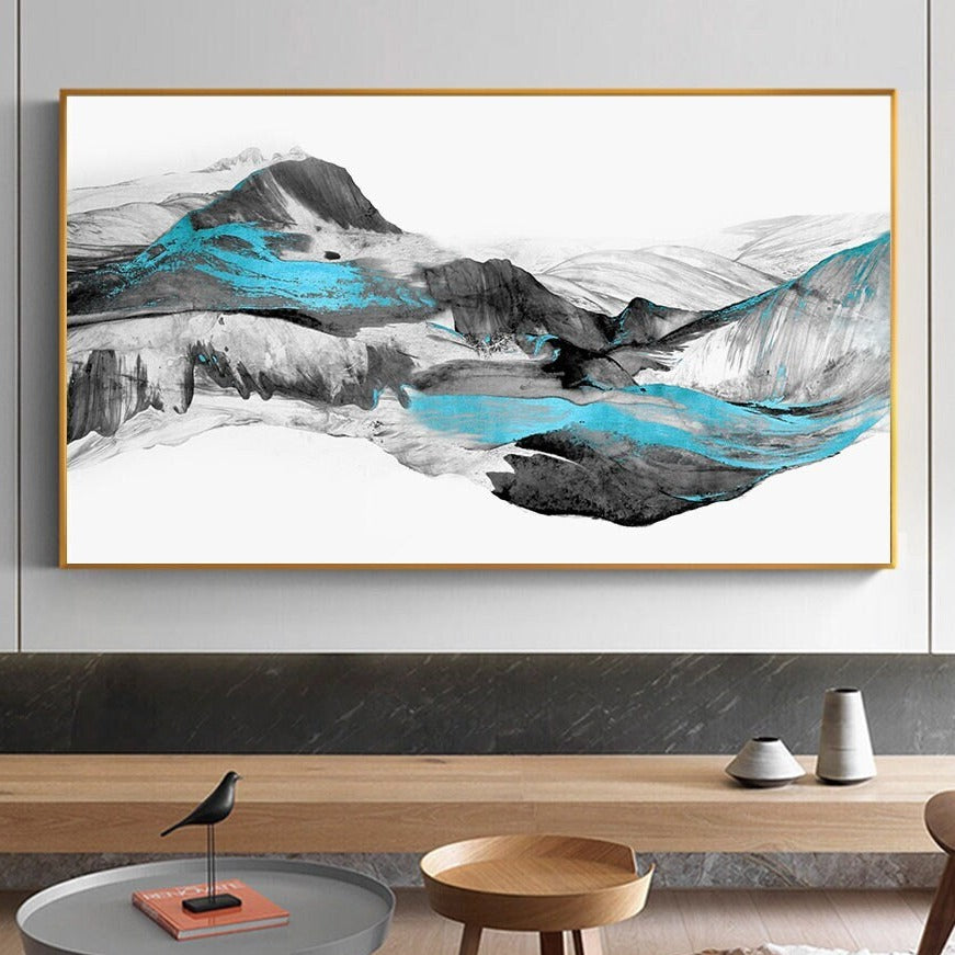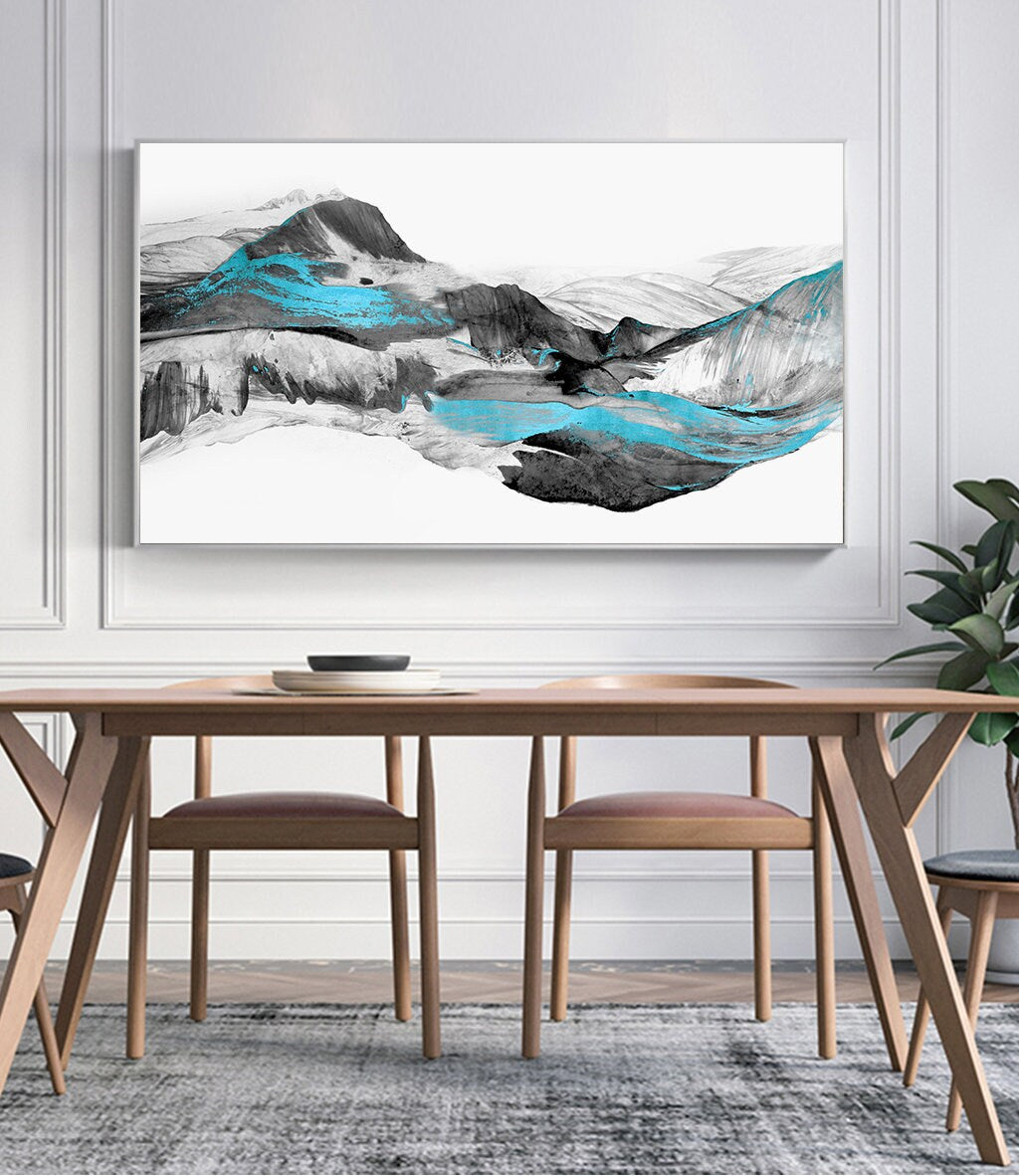 Großer gerahmter abstrakter Leinwanddruck, schwarz-weißes druckbares Kunstwerk im schwebenden Rahmen, moderne abstrakte Berge-Wandkunst fürs Wohnzimmer