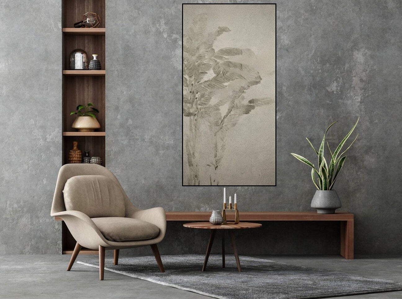 Großes graues Wandbild, gerahmter botanischer Leinwanddruck, schwebender Rahmen zum Aufhängen an der Wand, vertikale Wandkunst für Wohnzimmer, Kunstwerk für Schlafzimmer