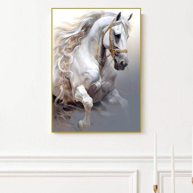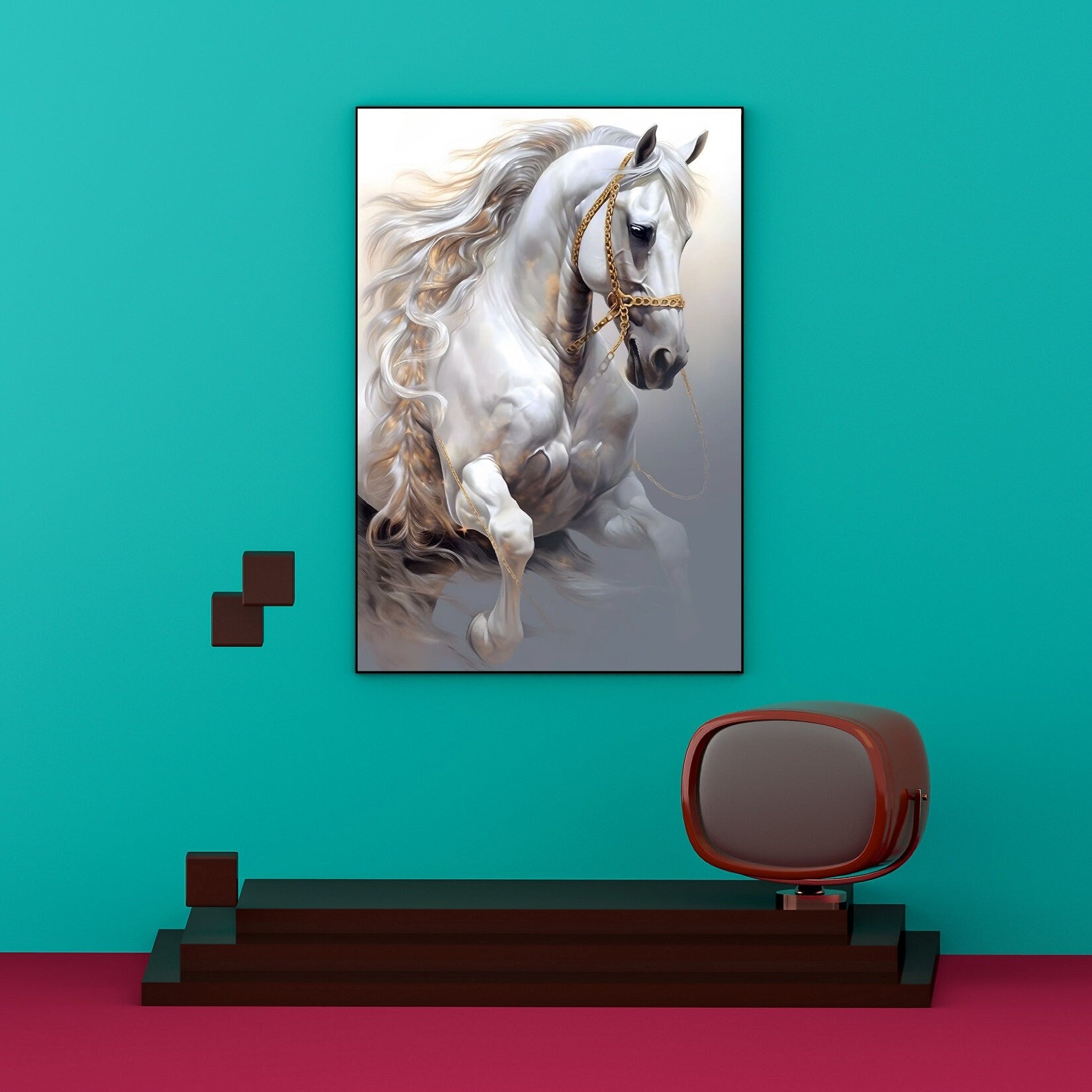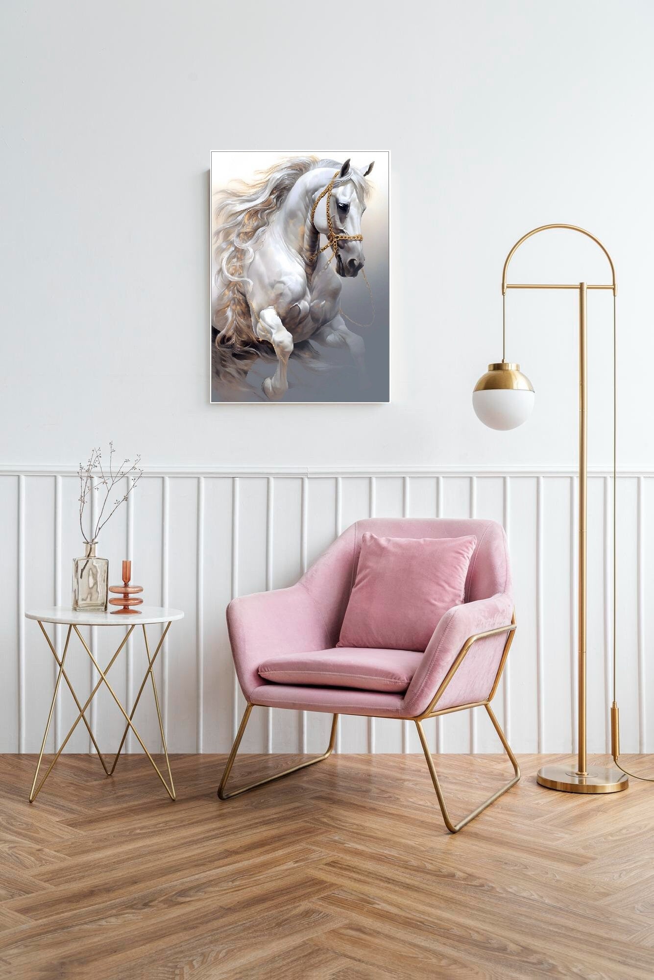 Großes Pferde-Wandbild, gerahmter Leinwanddruck mit Tieren, schwebendes Rahmenbild, weißes Pferd zum Aufhängen, druckbare grau-weiße Wandkunst
