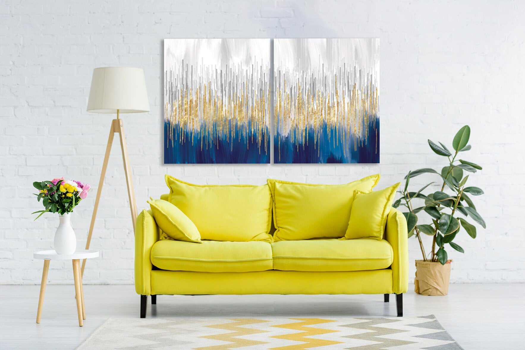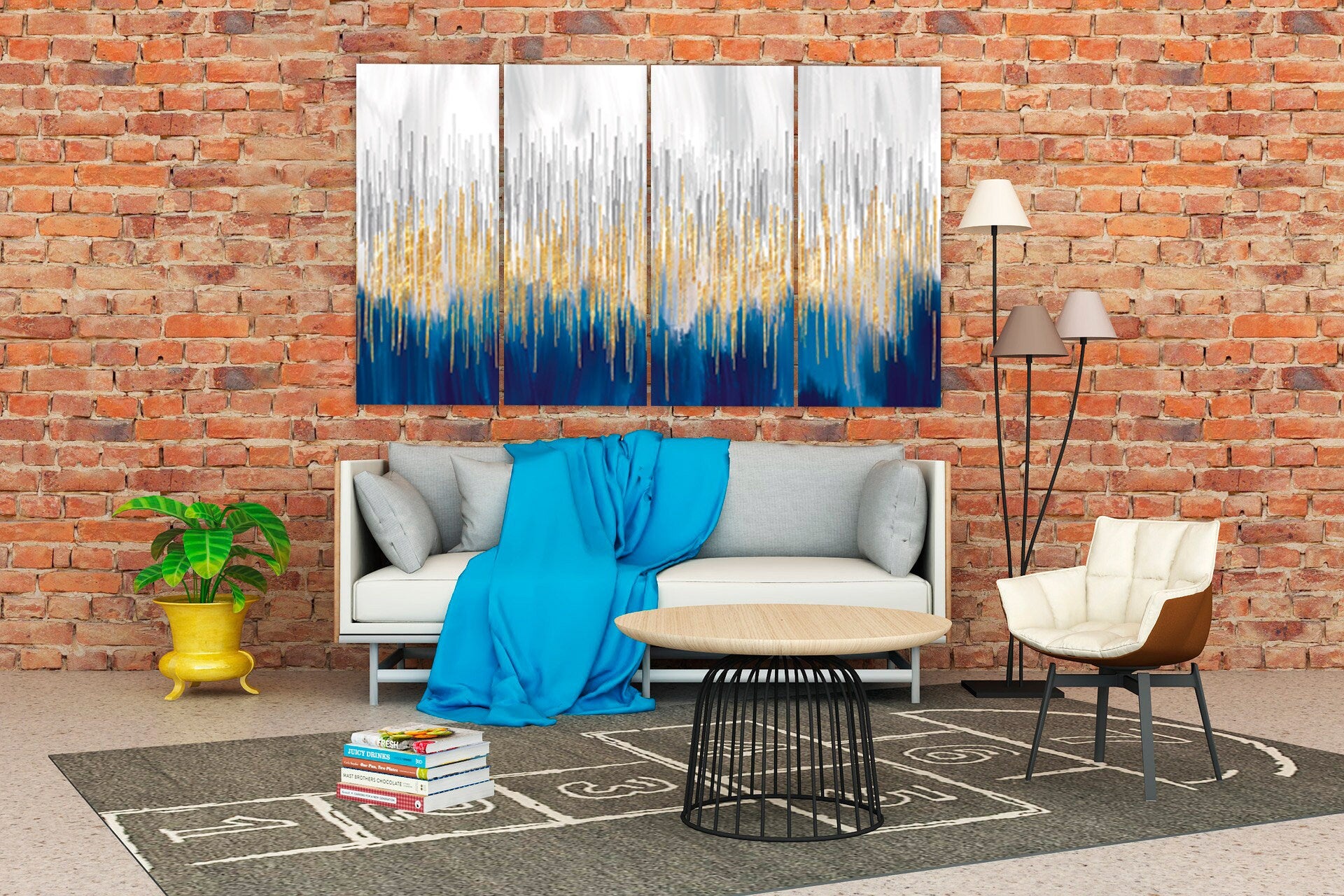 •Die Größe eines Gemäldesets, das aus mehreren Tafeln besteht, wird berechnet, indem die Tafeln zusammengezählt werden. Es wird empfohlen, solche Sets mit einem Abstand von 1–2 Zoll zwischen den Tafeln an der Wand anzubringen. Je größer die Bildelemente, desto größer ist der zulässige Abstand zwischen ihnen.