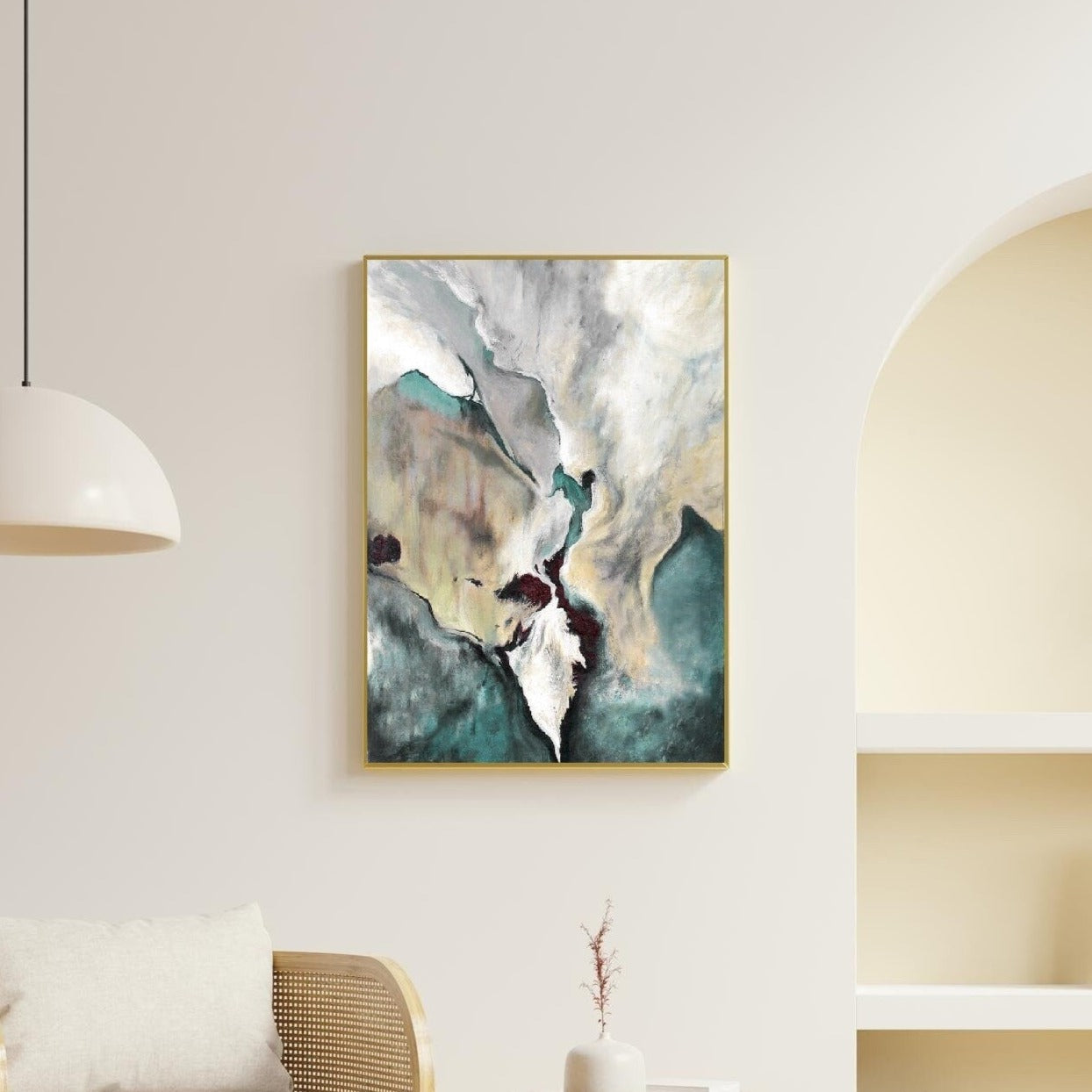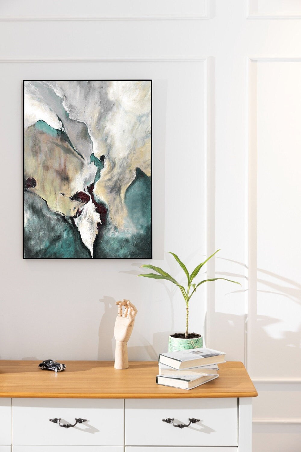 Moderner abstrakter Leinwanddruck, großer schwebender Marmorrahmen, blau-weiße Abstraktion fürs Wohnzimmer, gerahmtes Leinwandbild als Geschenk