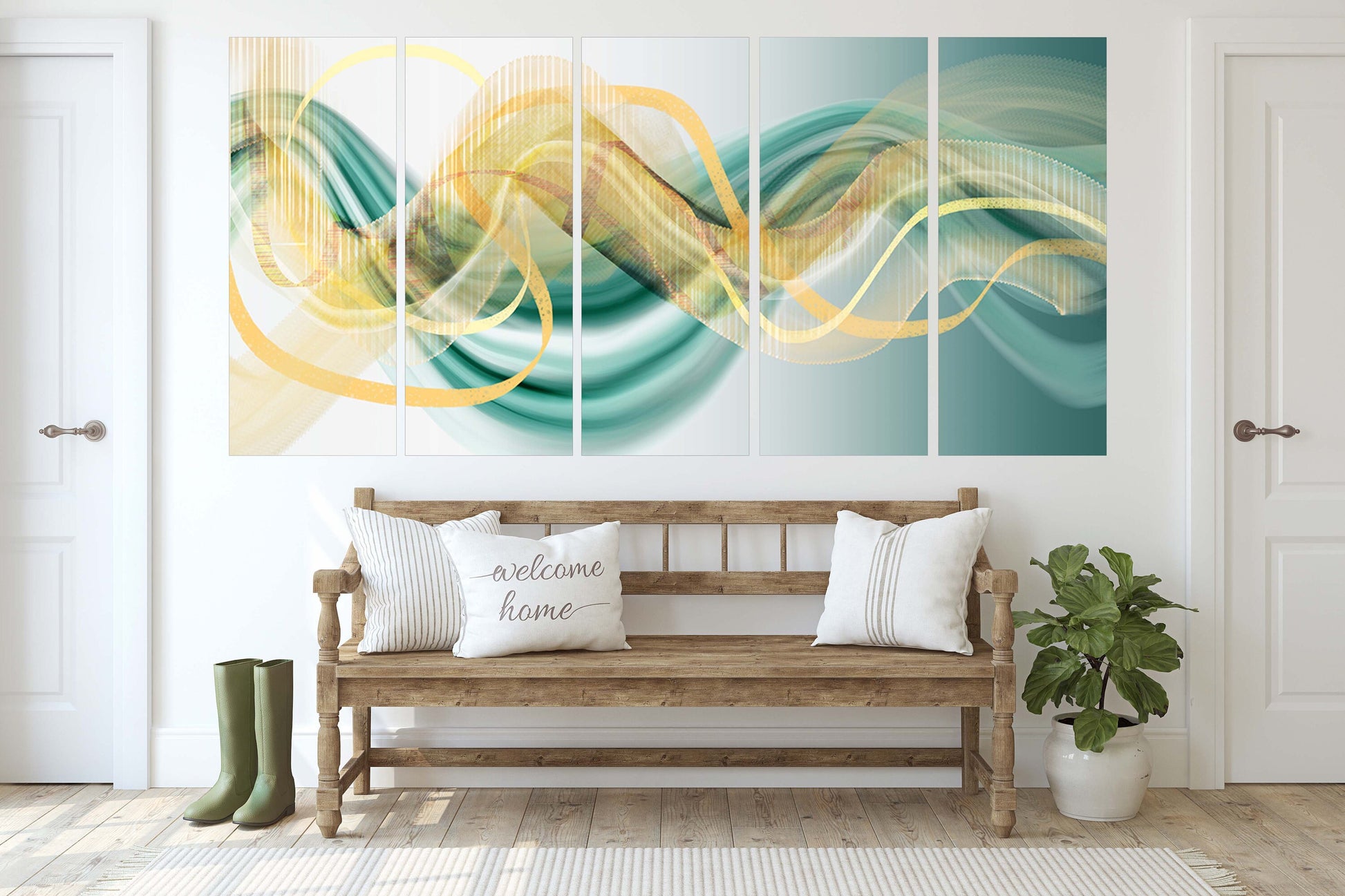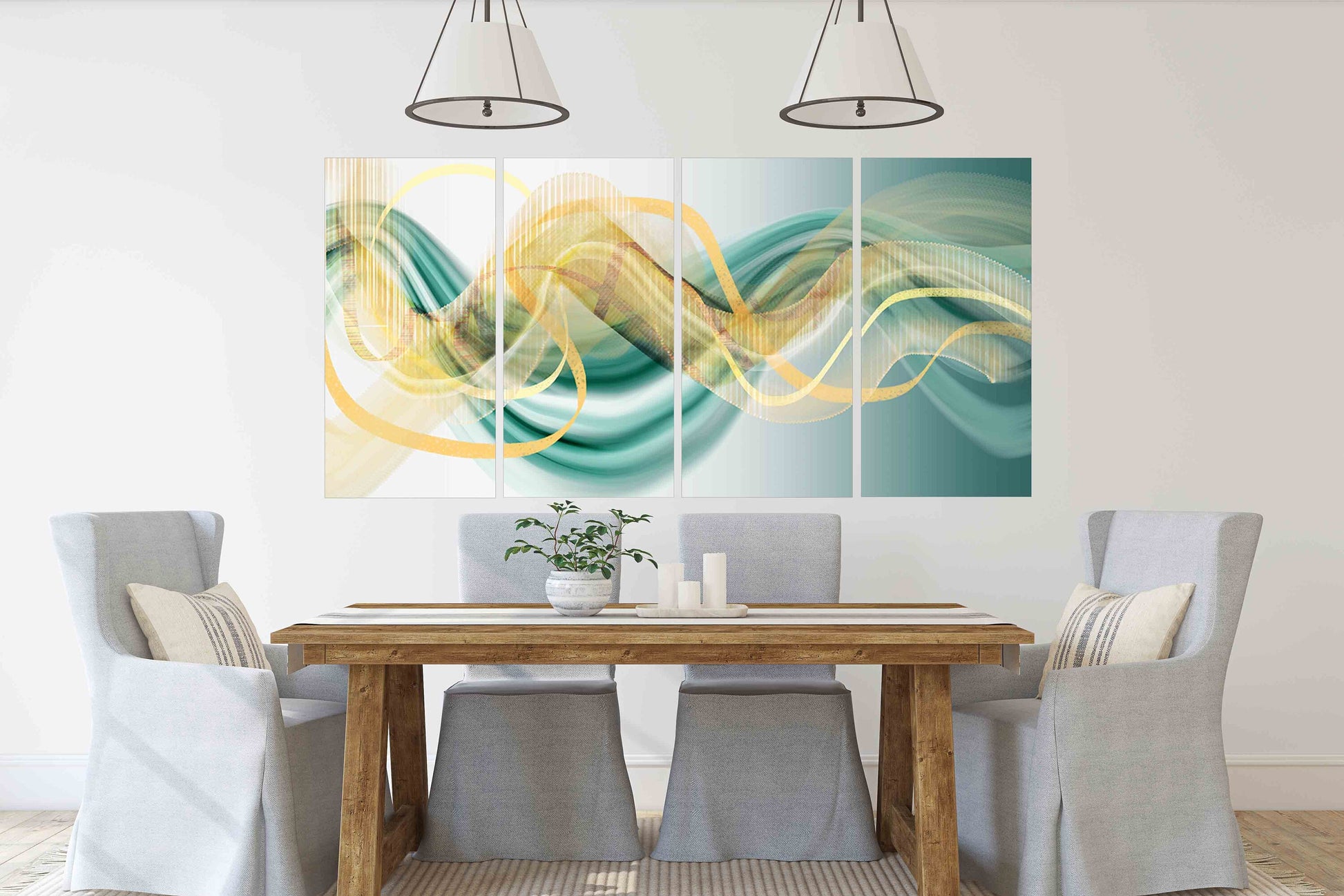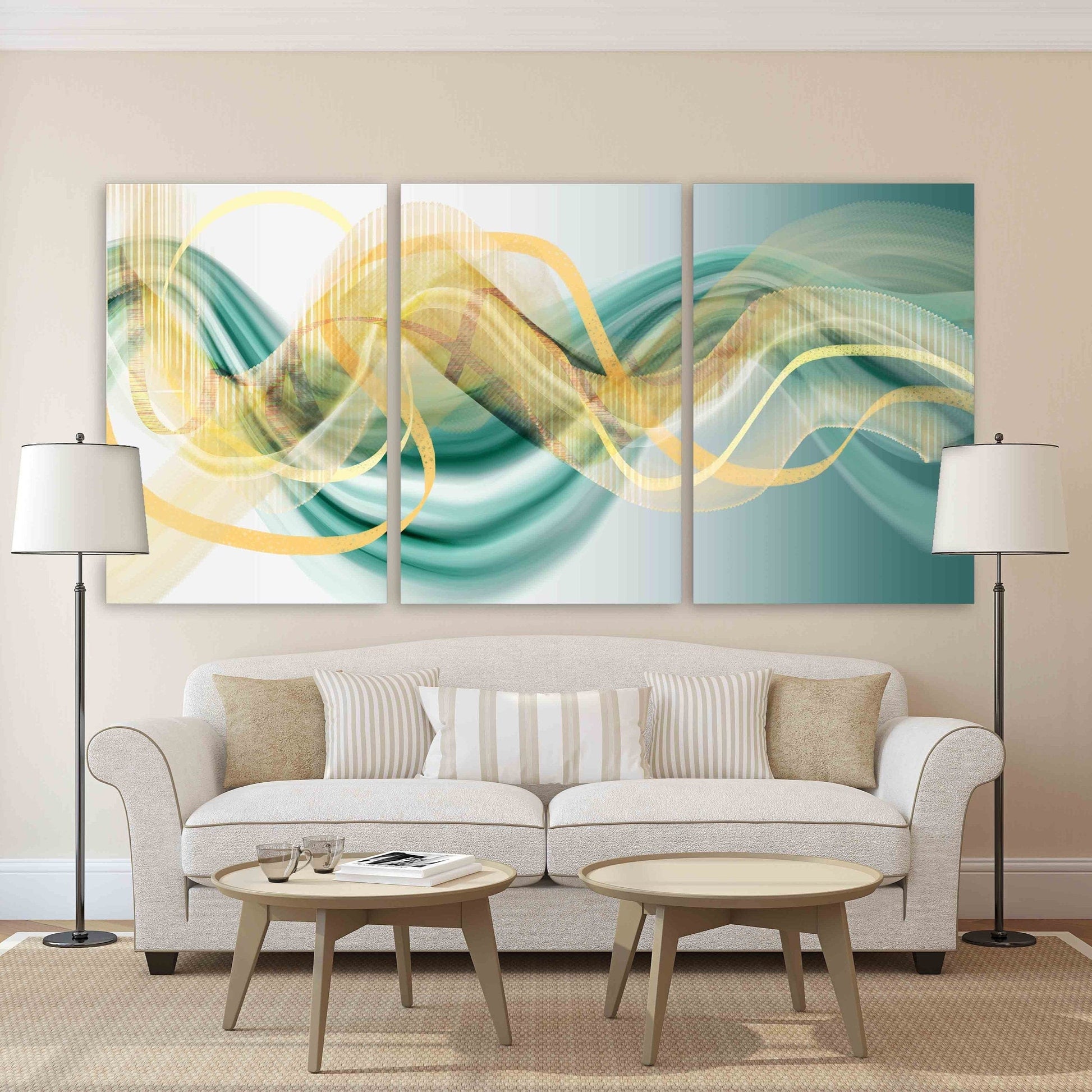 •Die Größe eines Gemäldesets, das aus mehreren Tafeln besteht, wird berechnet, indem die Tafeln zusammengezählt werden. Es wird empfohlen, solche Sets mit einem Abstand von 1–2 Zoll zwischen den Tafeln an der Wand anzubringen. Je größer die Bildelemente, desto größer ist der zulässige Abstand zwischen ihnen.