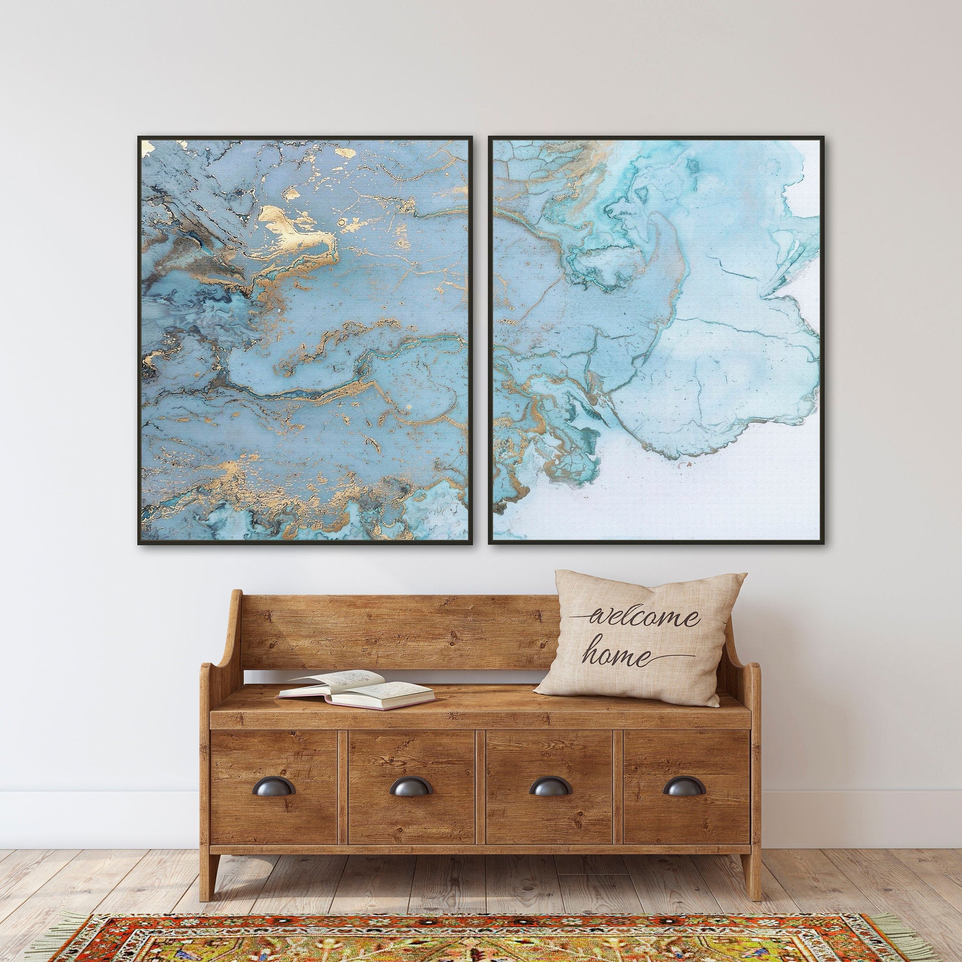 Moderne gerahmte blaue abstrakte Leinwand-Wandkunst, 3er-Set extragroße Drucke in schwarzem Schweberahmen, trendige mehrteilige Gemälde auf Leinwand