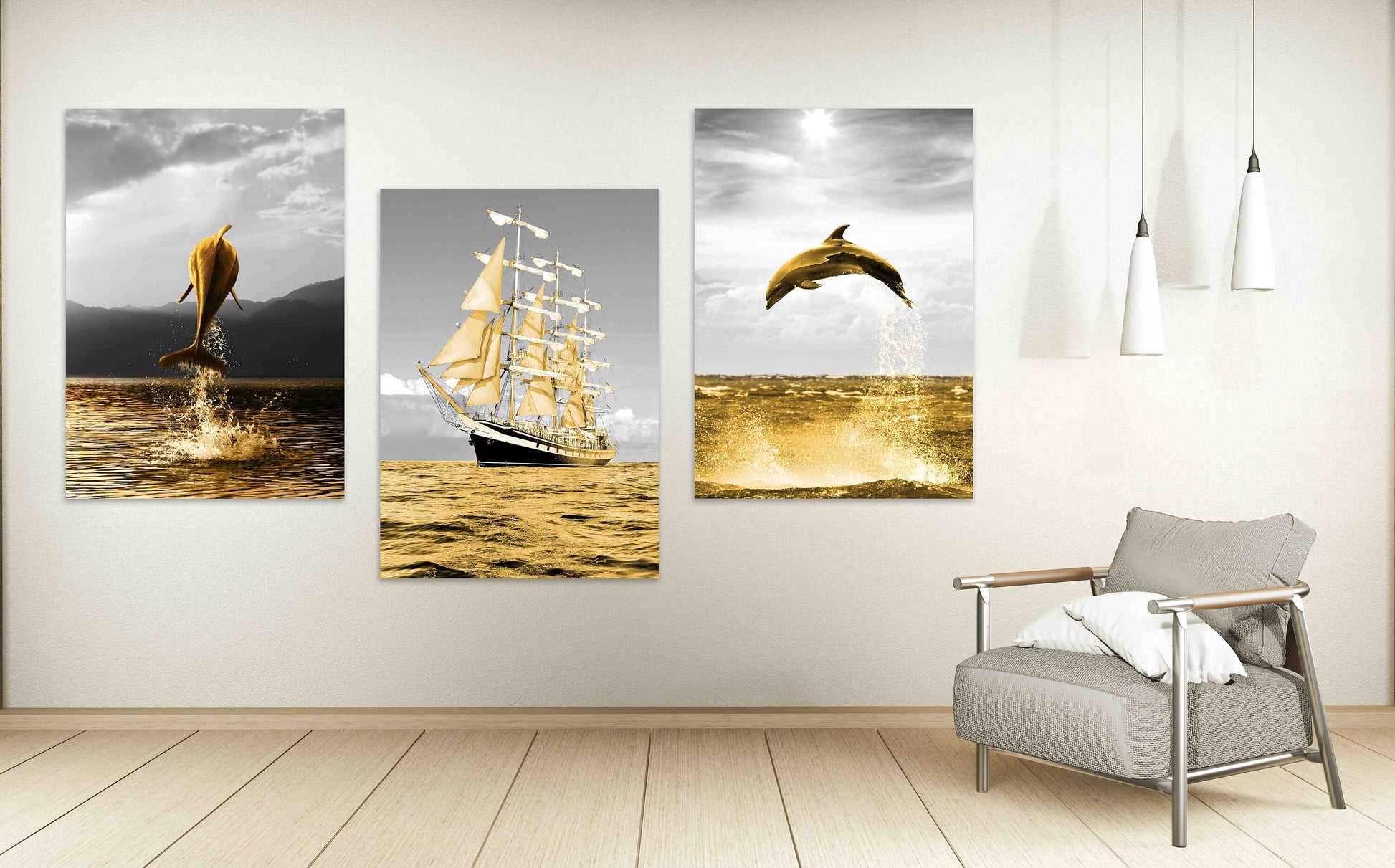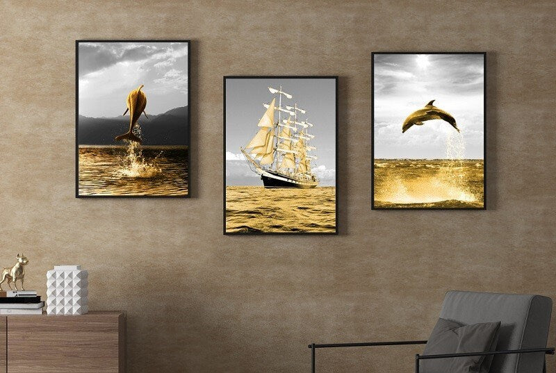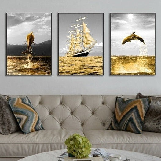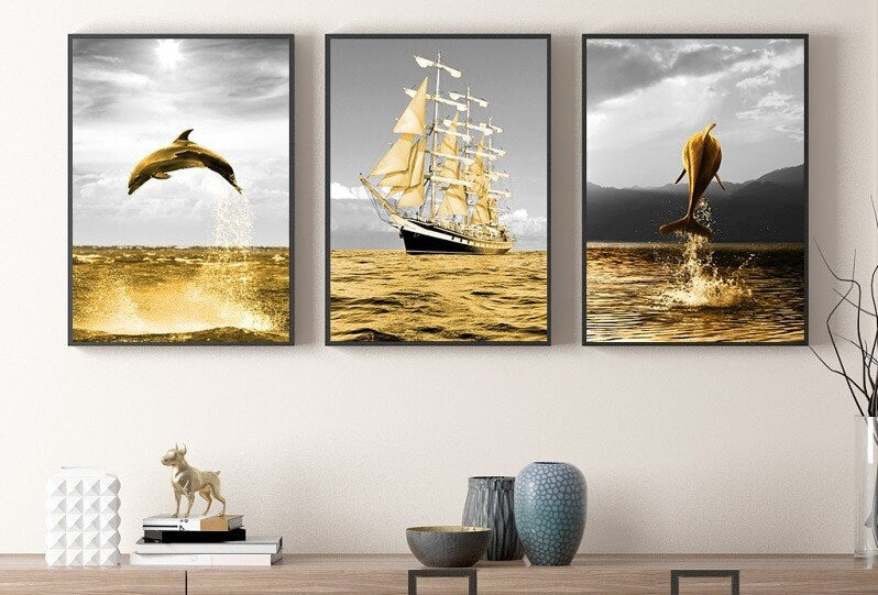 Moderne gerahmte Meereswandkunst, Meereslandschafts-Leinwanddruck im schwebenden Rahmen, 3er-Set Drucke in goldgrauen Farben, Gemälde mit Delfin und Schiff