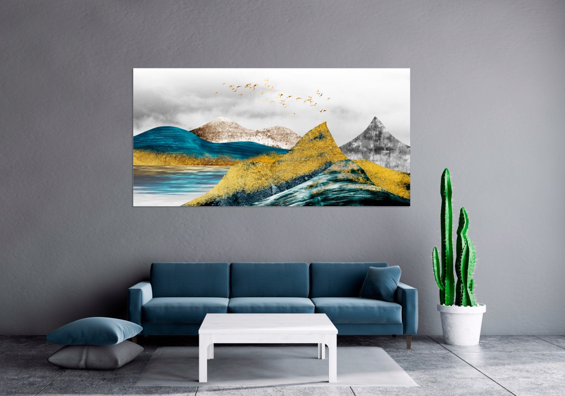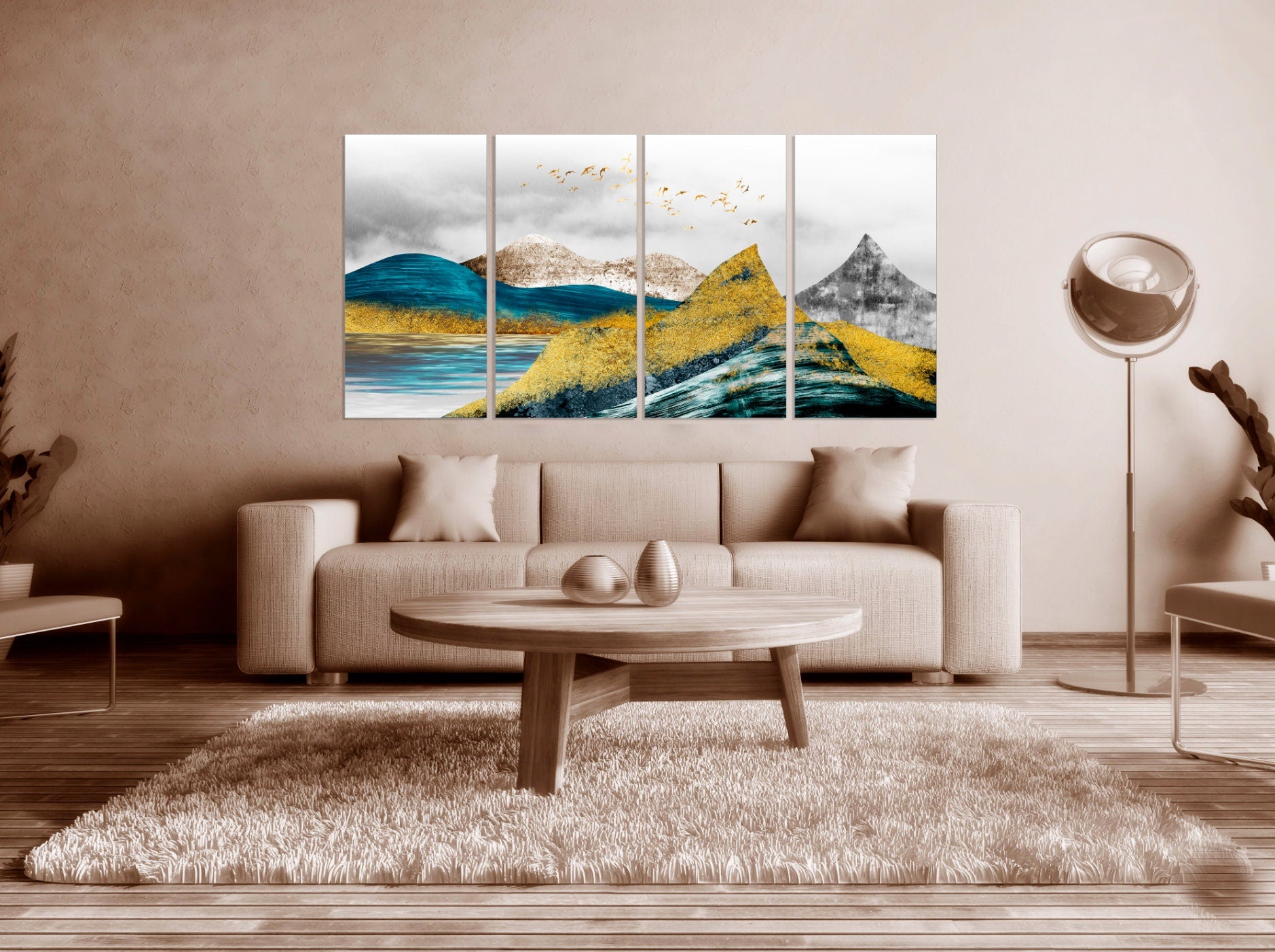 • Die Größe eines Gemäldesets, das aus mehreren Tafeln besteht, wird berechnet, indem die Tafeln zusammengezählt werden. Es wird empfohlen, solche Sets mit einem Abstand von 1–2 Zoll zwischen den Tafeln an die Wand zu hängen. Je größer die Bildelemente sind, desto größer ist der zulässige Abstand zwischen ihnen.