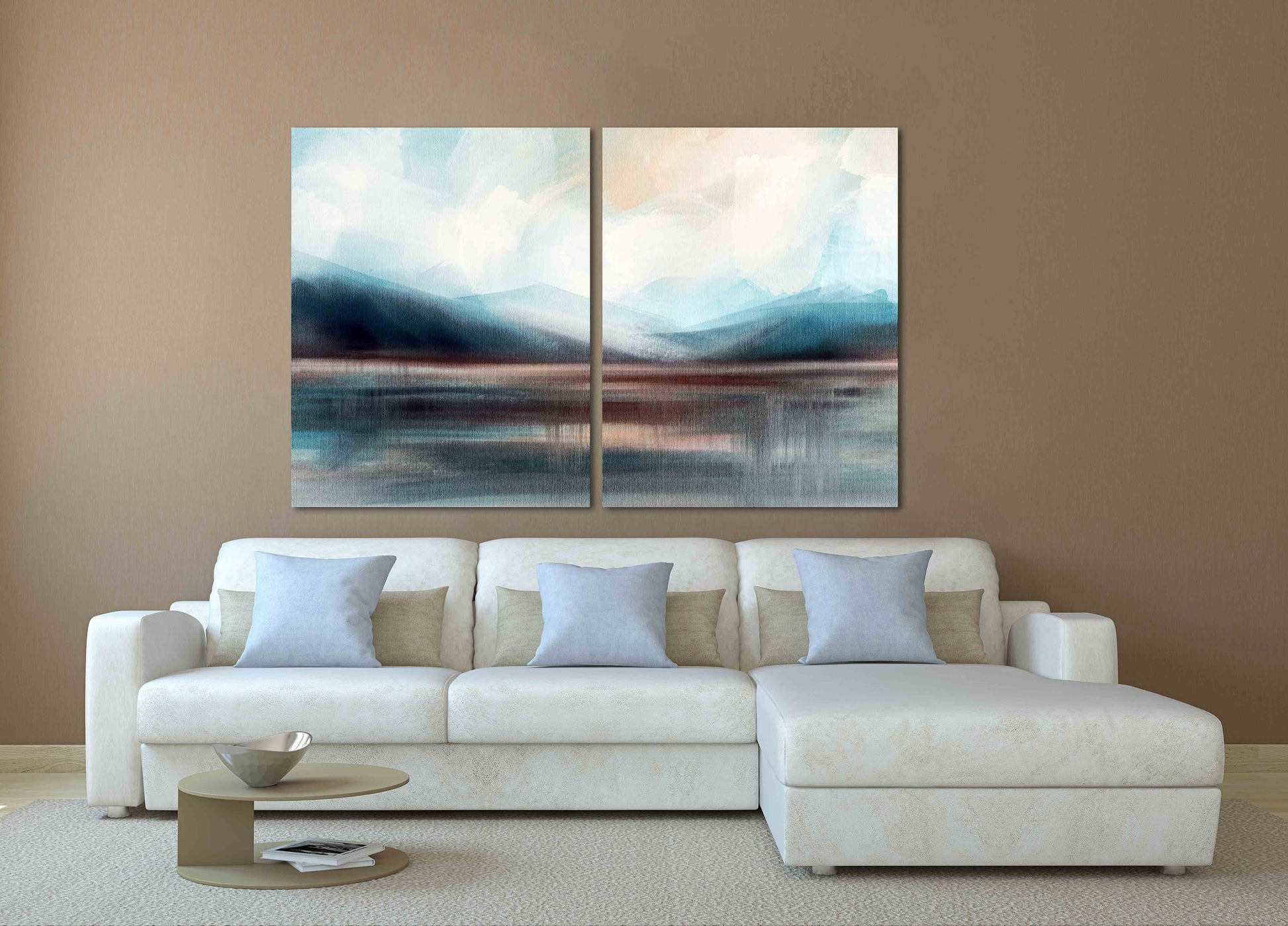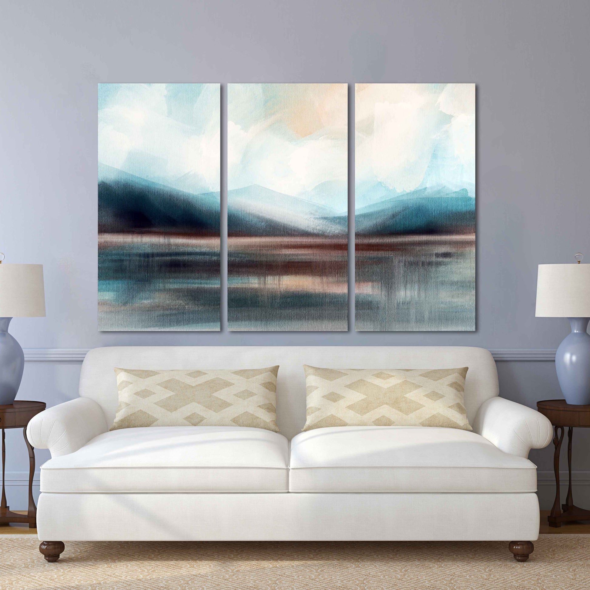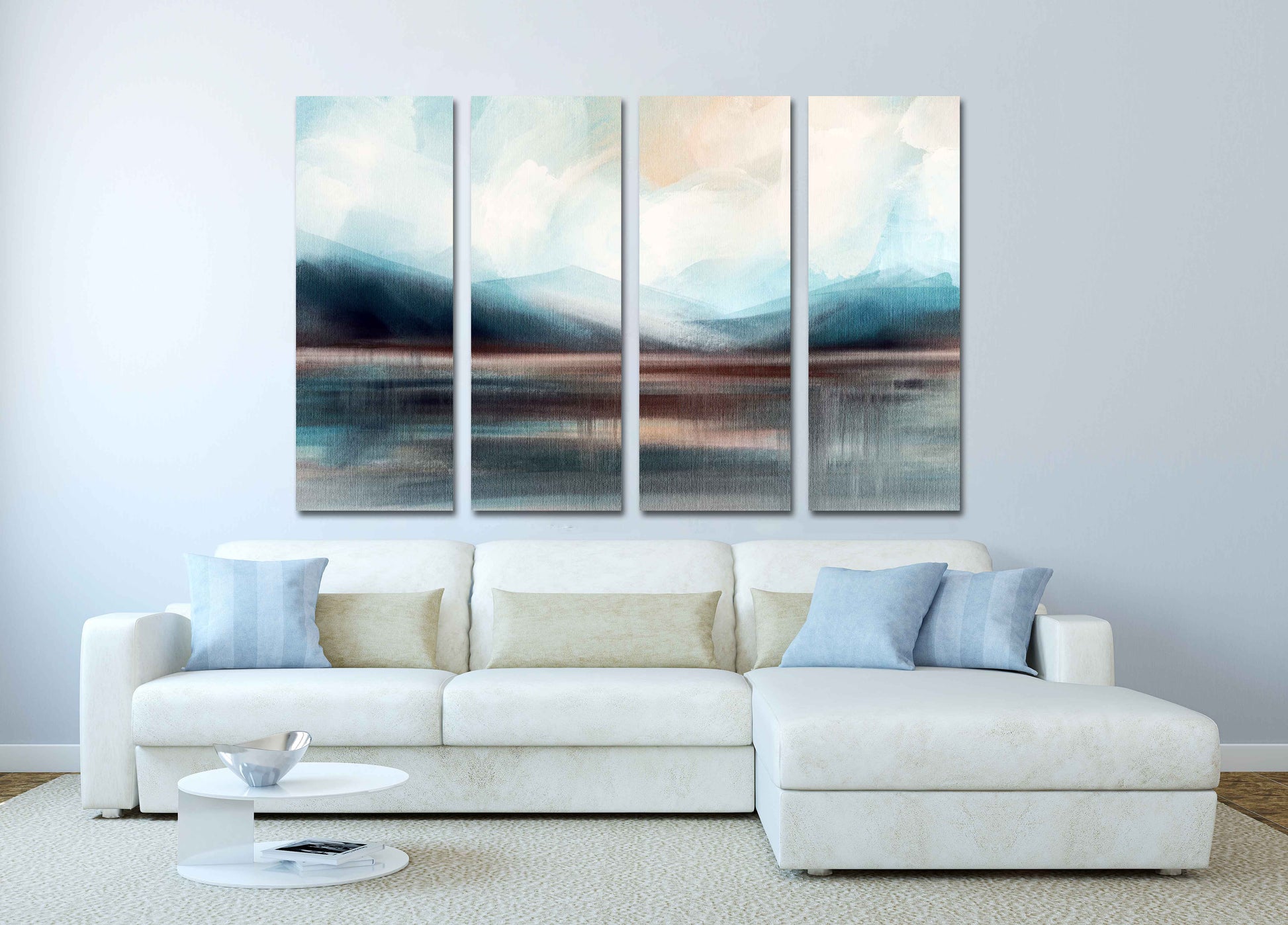 •Die Größe eines Gemäldesets, das aus mehreren Tafeln besteht, wird berechnet, indem die Tafeln zusammengezählt werden. Es wird empfohlen, solche Sets mit einem Abstand von 1–2 Zoll zwischen den Tafeln an der Wand anzubringen. Je größer die Bildelemente, desto größer ist der zulässige Abstand zwischen ihnen.