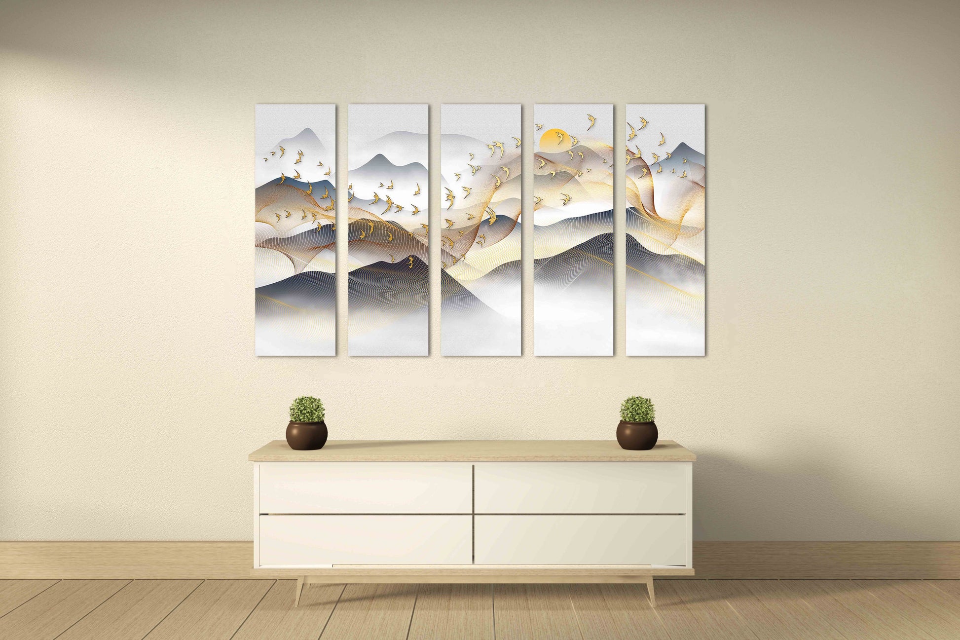 •Die Größe eines Gemäldesets, das aus mehreren Tafeln besteht, wird berechnet, indem die Tafeln zusammengezählt werden. Es wird empfohlen, solche Sets mit einem Abstand von 1–2 Zoll zwischen den Tafeln an der Wand anzubringen. Je größer die Bildelemente, desto größer ist der zulässige Abstand zwischen ihnen.